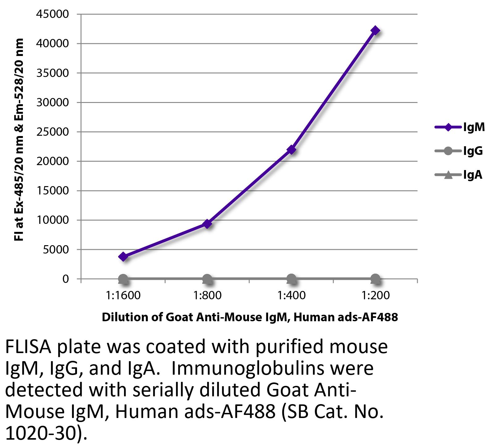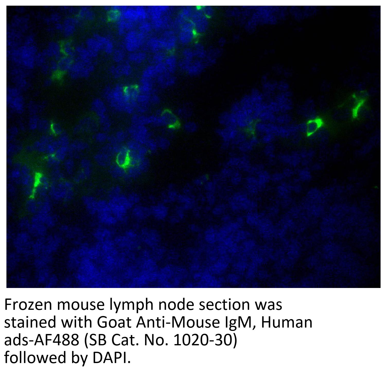 Goat Anti-Mouse IgM-Alexa Fluor 488 antibody with minimal reactivity to human proteins for use in flow cytometry, immunohistochemistry / immunocytochemistry, and western blot assays.