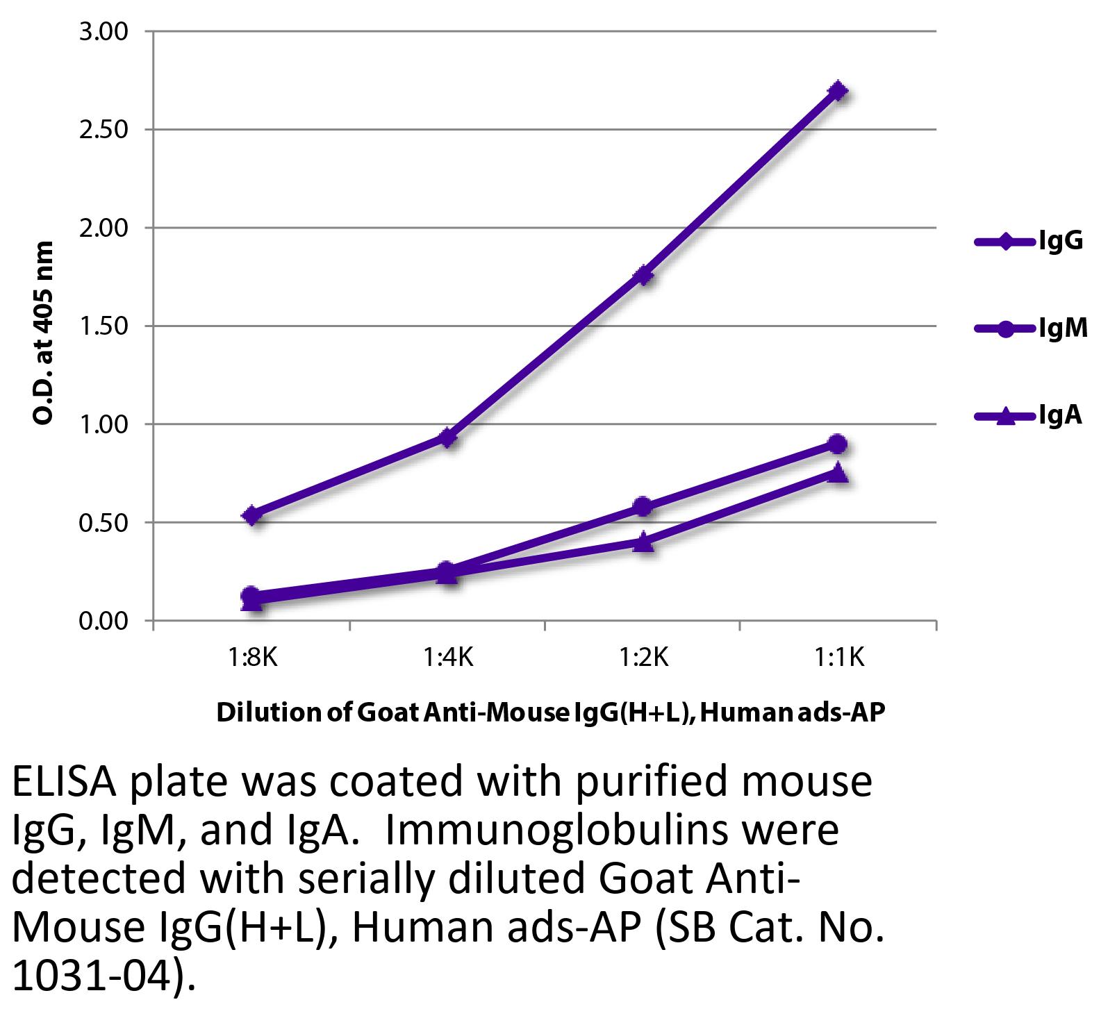 Goat Anti-Mouse IgG(H+L)-AP antibody with minimal reactivity to human proteins for use in ELISA, immunohistochemistry / immunocytochemistry, western blot, and ELISpot assays.