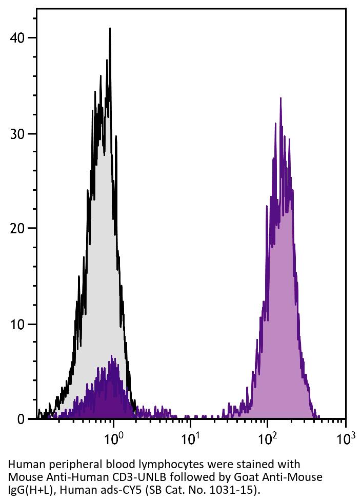 Goat Anti-Mouse IgG(H+L)-CY5 antibody with minimal reactivity to human proteins for use in flow cytometry, immunohistochemistry / immunocytochemistry, and western blot assays.