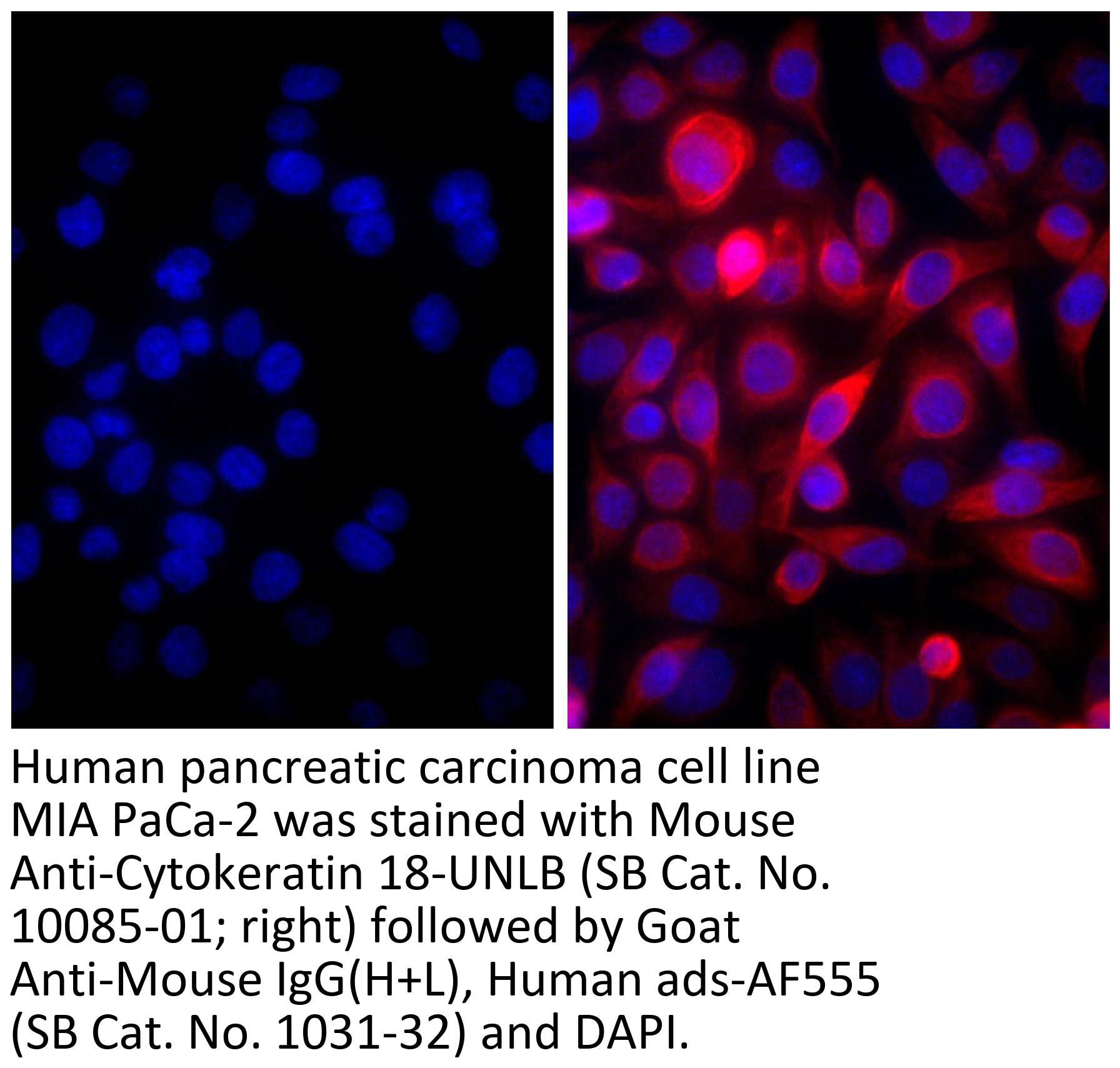 Goat Anti-Mouse IgG(H+L)-Alexa Fluor 555 antibody with minimal reactivity to human proteins for use in immunohistochemistry / immunocytochemistry and western blot assays.