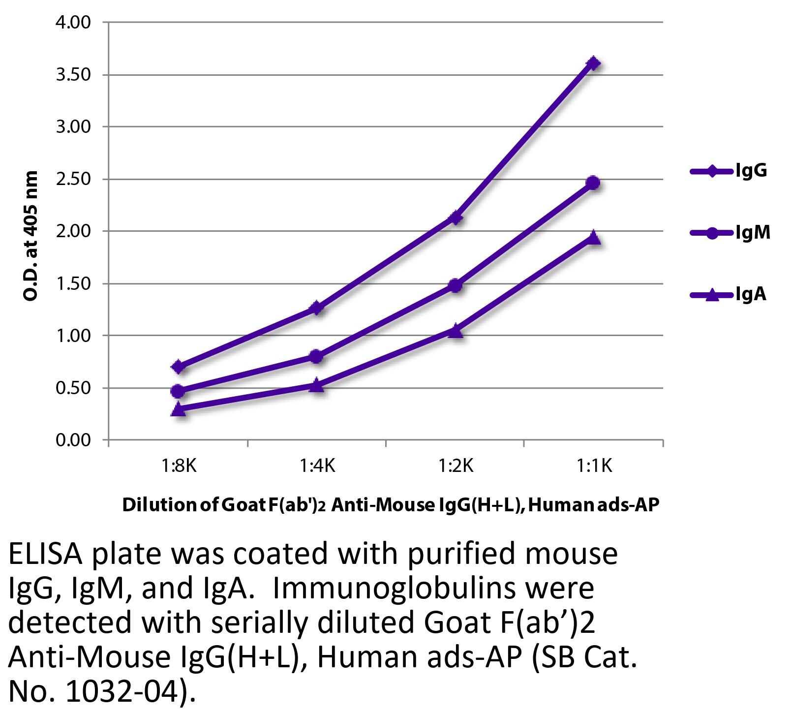 Goat F(ab')2 Anti-Mouse IgG(H+L)-AP antibody with minimal reactivity to human proteins for use in ELISA, immunohistochemistry / immunocytochemistry, western blot, and ELISpot assays.