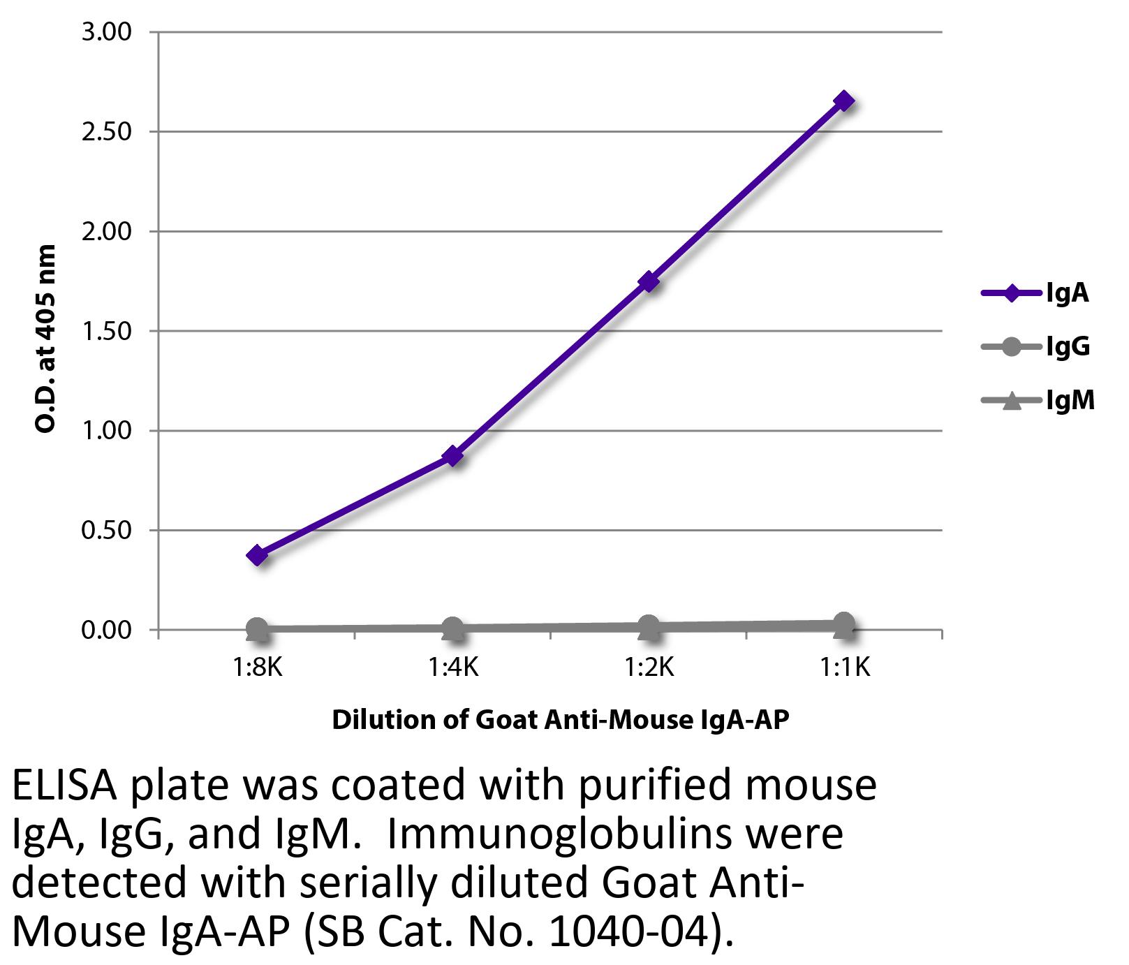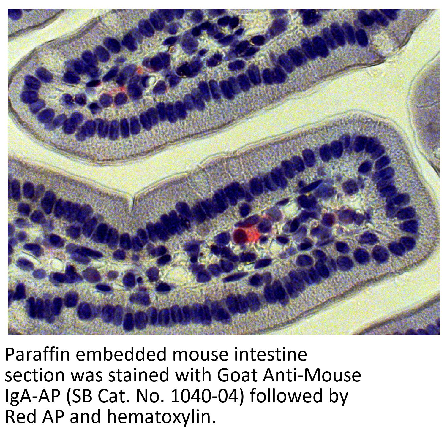 Goat Anti-Mouse IgA-AP antibody for use in ELISA, immunohistochemistry / immunocytochemistry, western blot, and ELISpot assays.