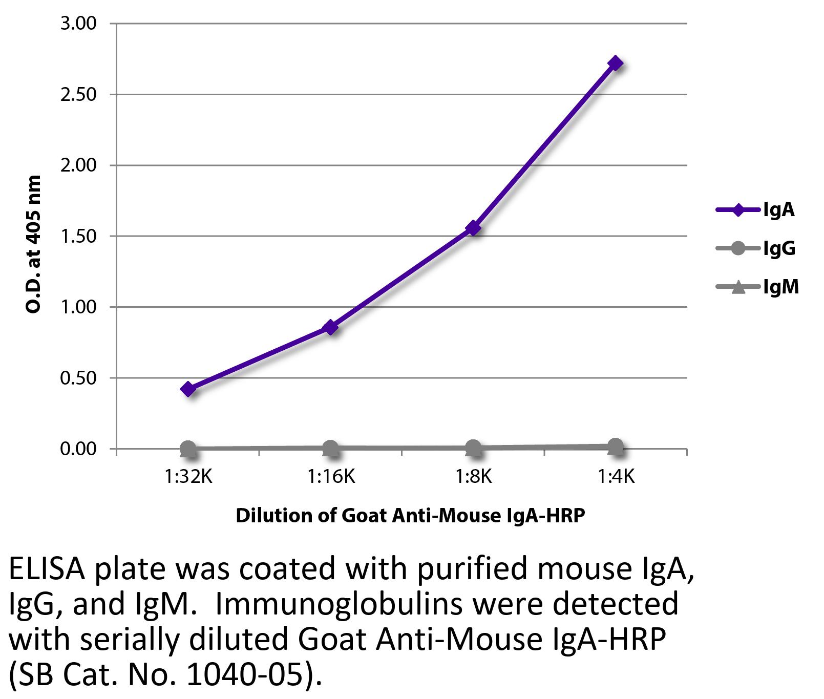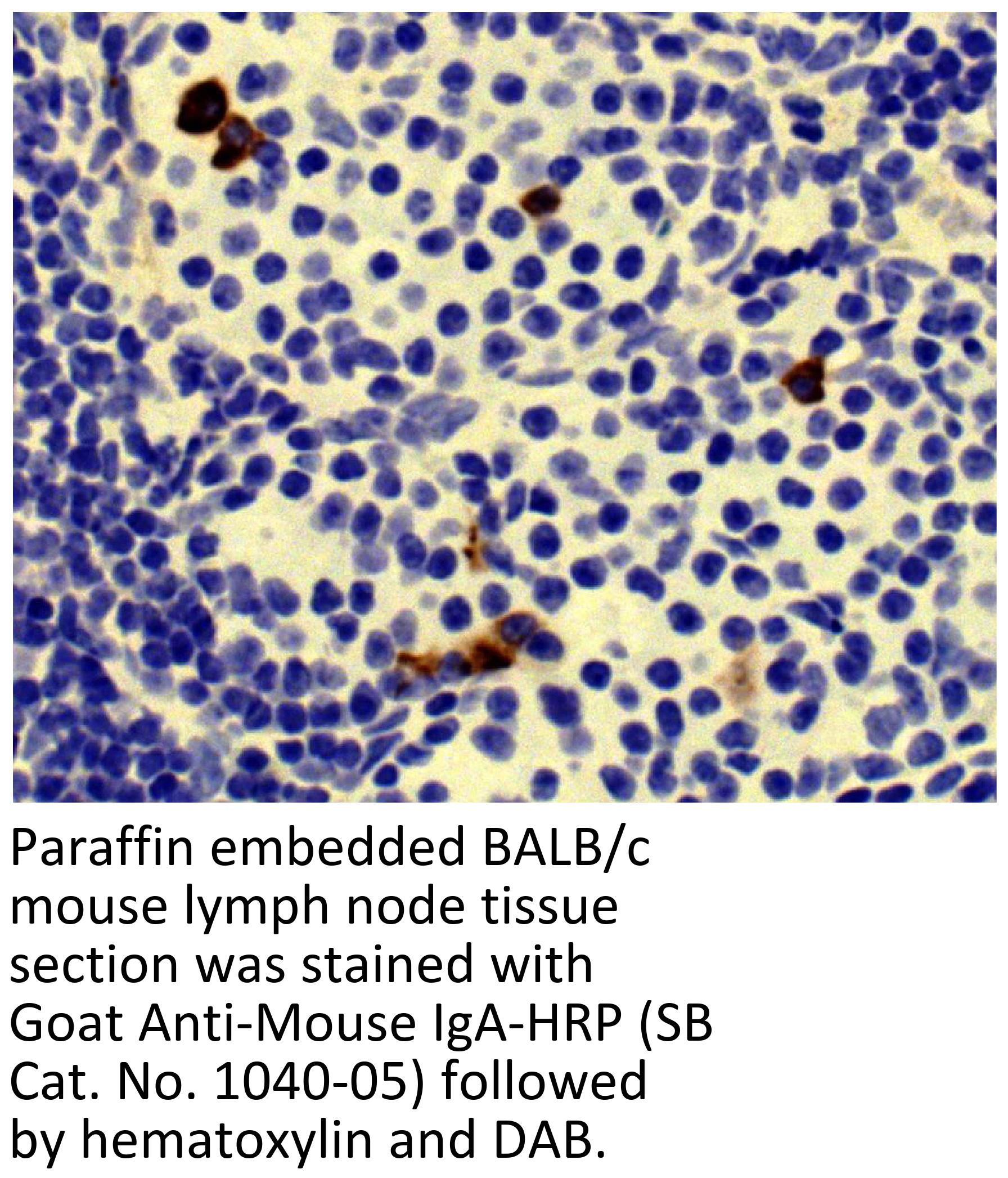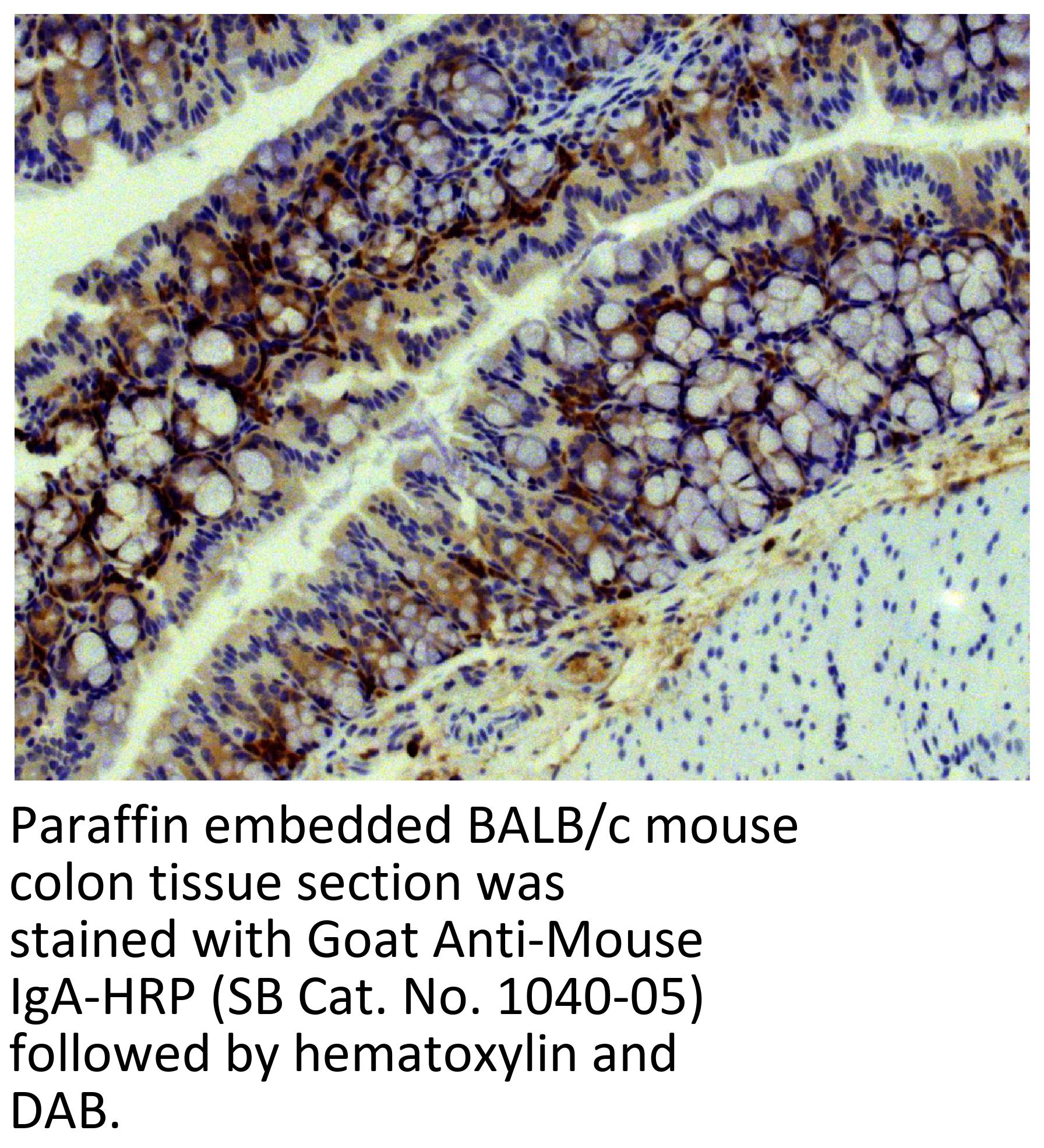 Goat Anti-Mouse IgA-HRP antibody for use in ELISA, immunohistochemistry / immunocytochemistry, western blot, and ELISpot assays.