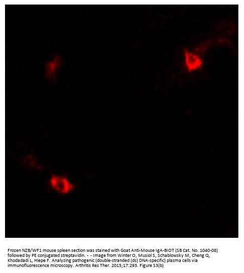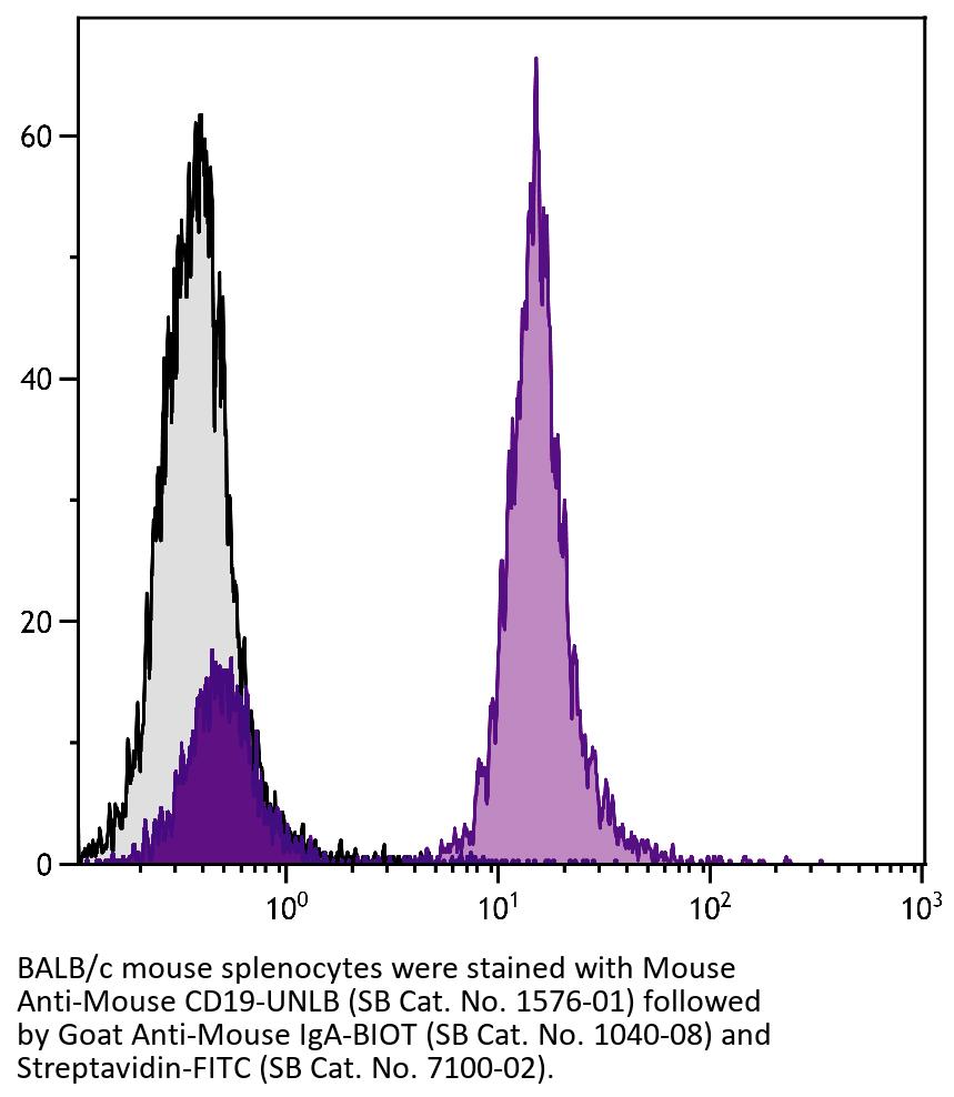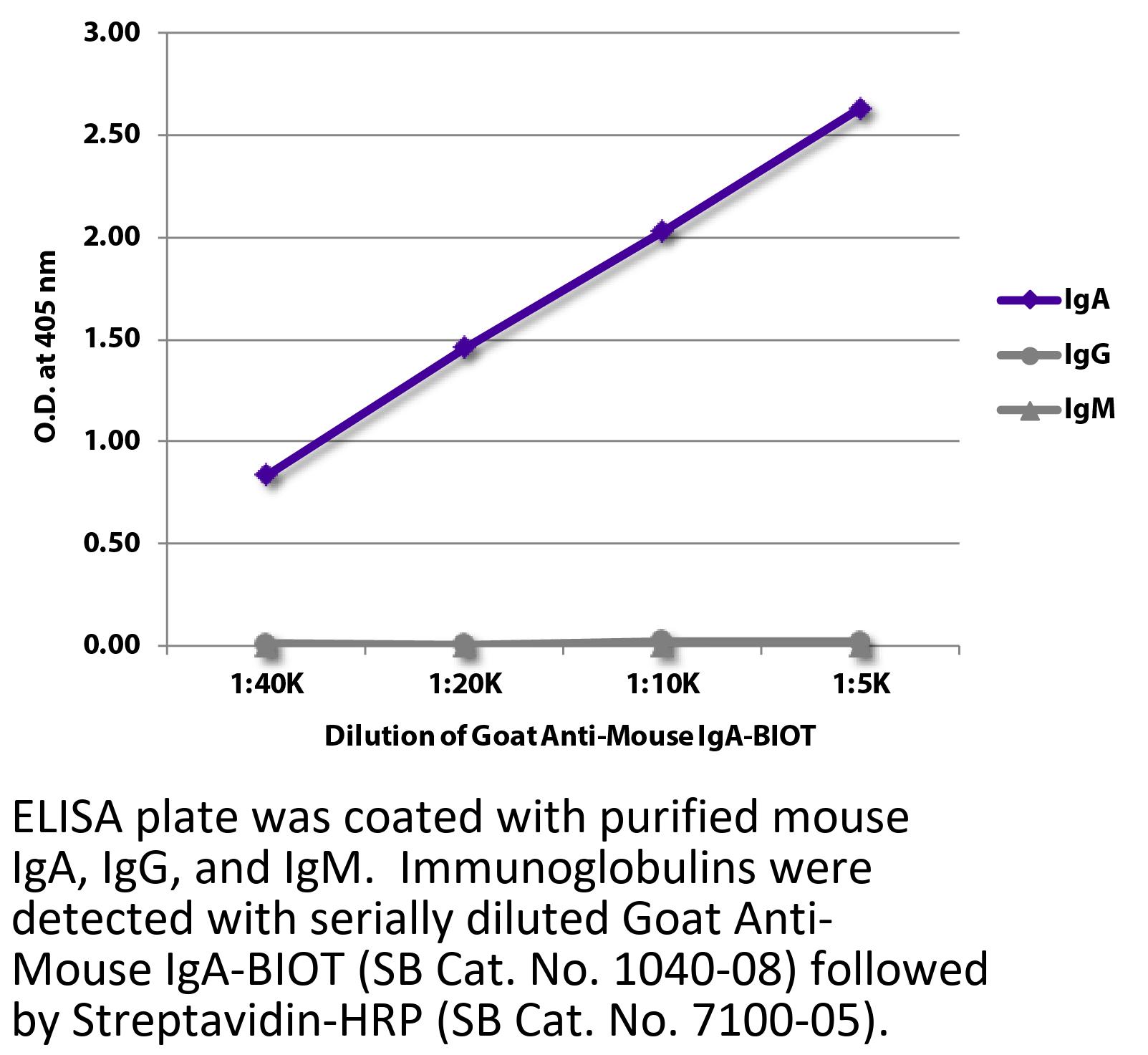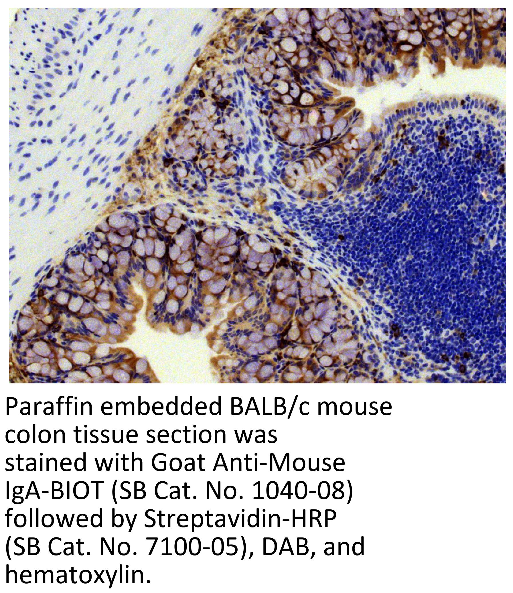 Goat Anti-Mouse IgA-Biotin antibody for use in ELISA, flow cytometry, immunohistochemistry / immunocytochemistry, western blot, ELISpot, and separation assays.
