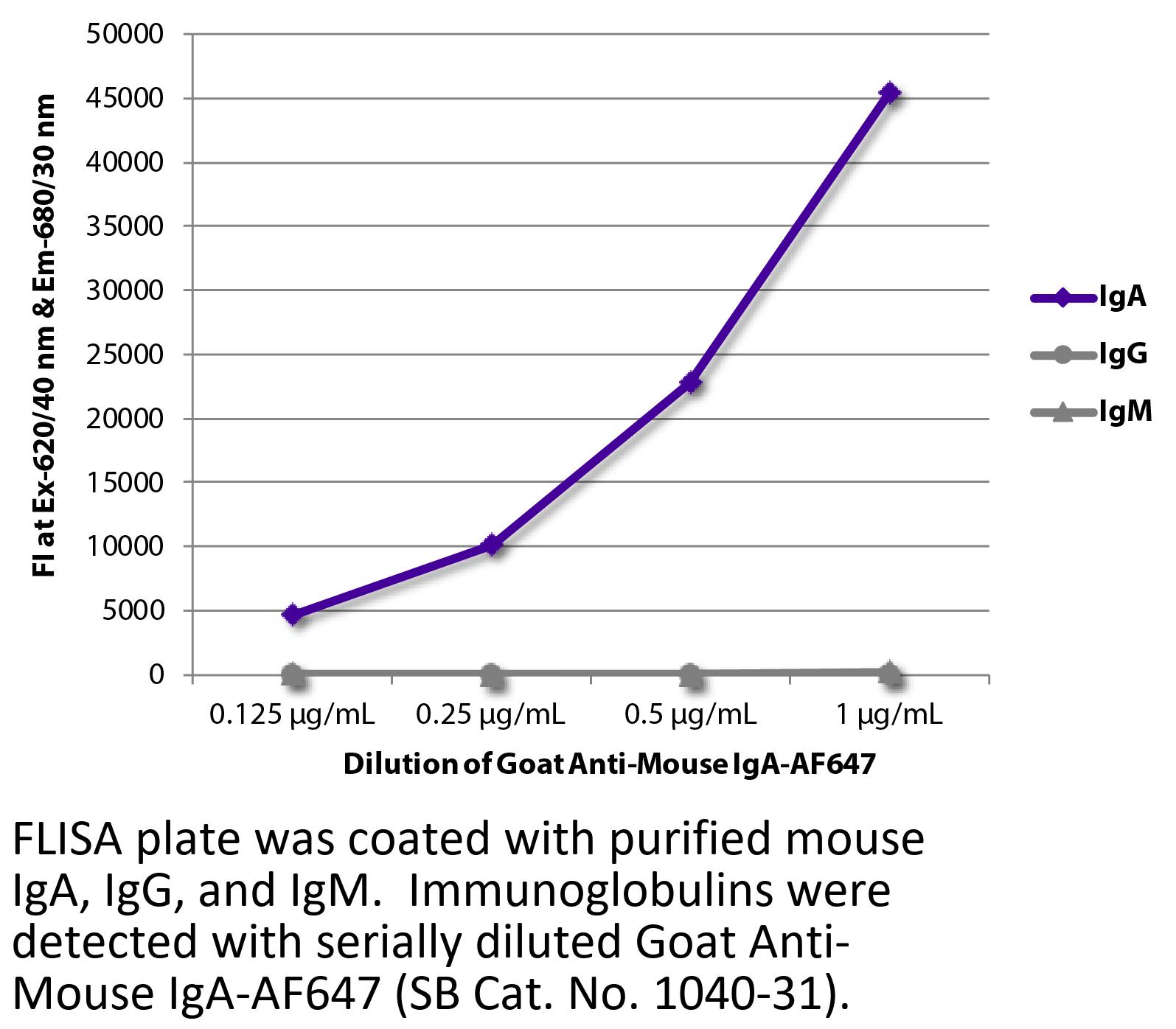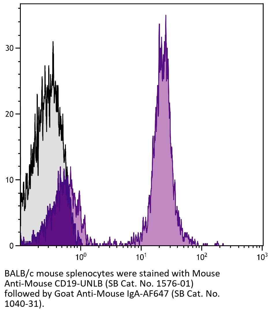 Goat Anti-Mouse IgA-Alexa Fluor 647 antibody for use in flow cytometry, immunohistochemistry / immunocytochemistry, and western blot assays.