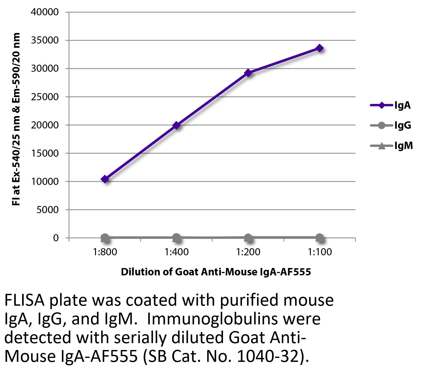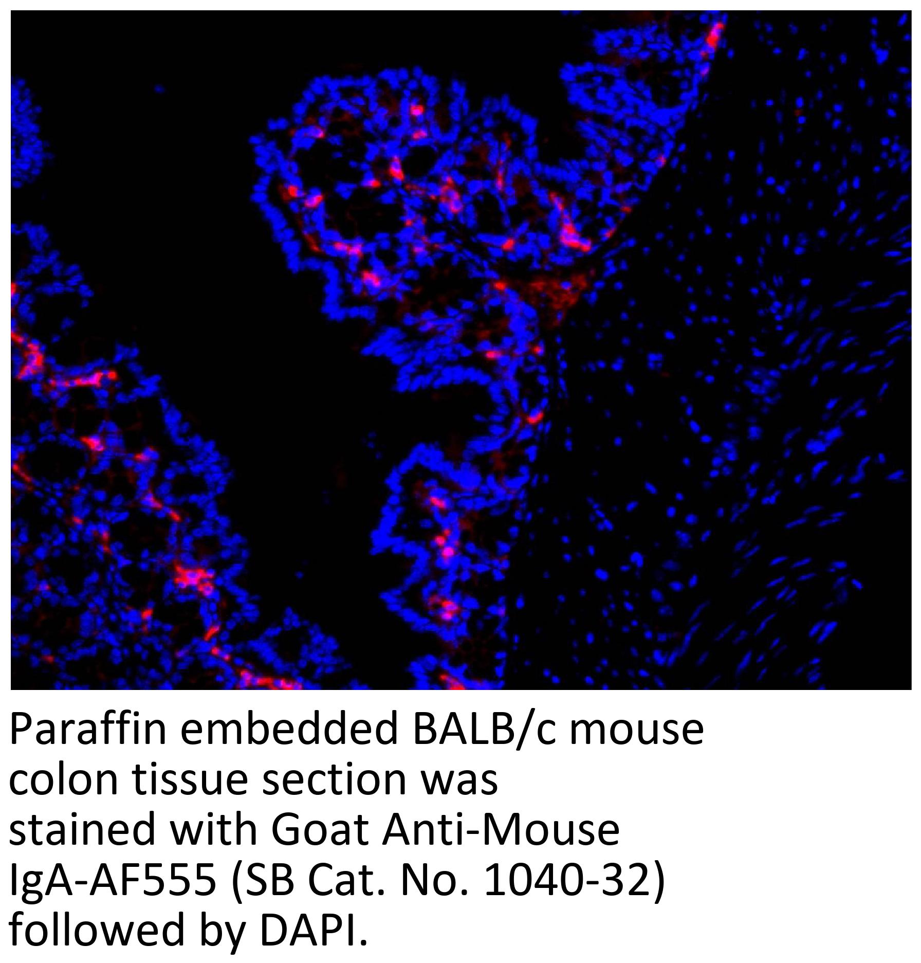 Goat Anti-Mouse IgA-Alexa Fluor 555 antibody for use in immunohistochemistry / immunocytochemistry and western blot assays.