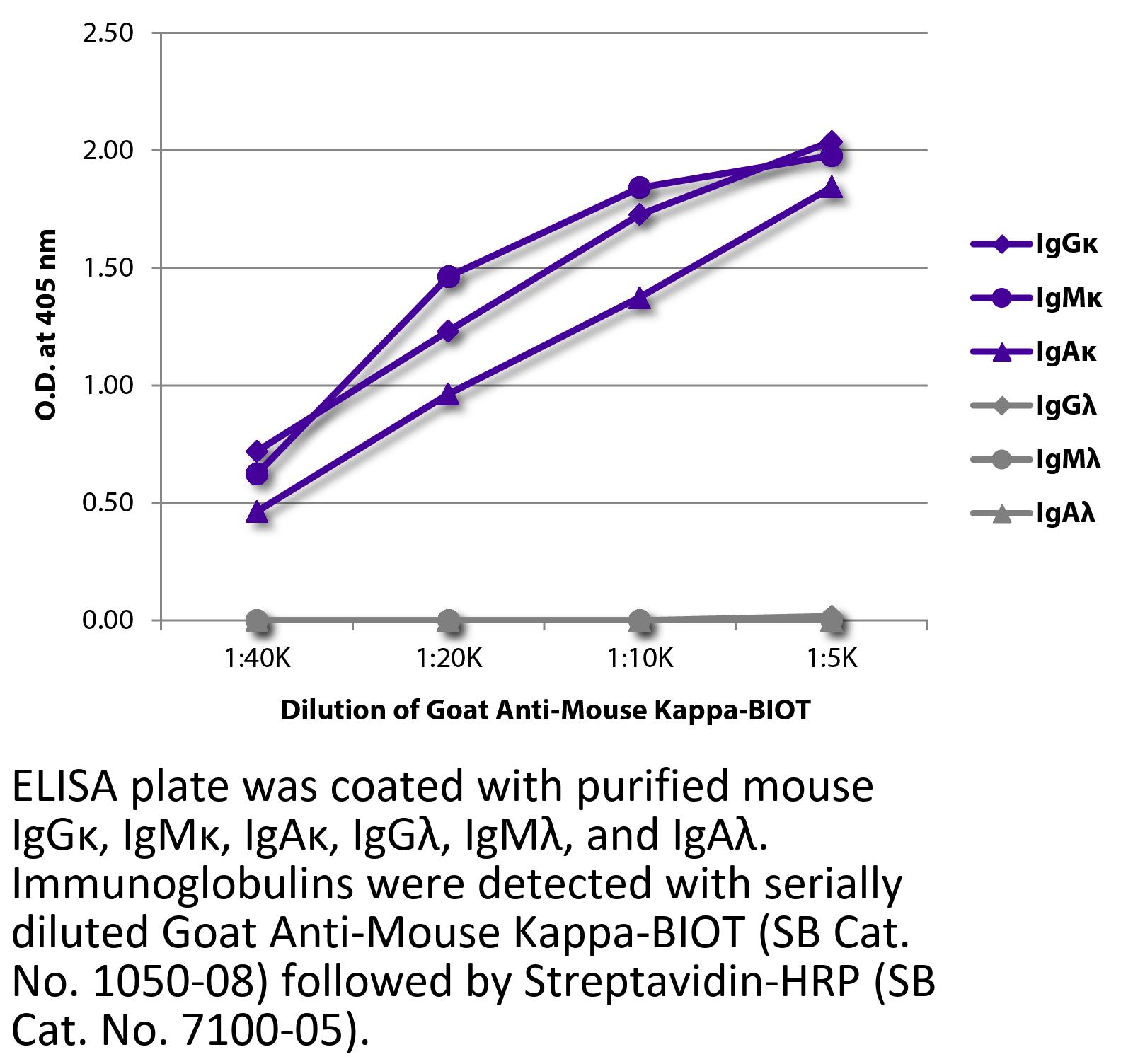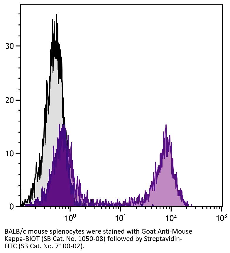Goat Anti-Mouse Kappa-Biotin antibody for use in ELISA, flow cytometry, immunohistochemistry / immunocytochemistry, western blot, immunoprecipitation, and ELISpot assays.