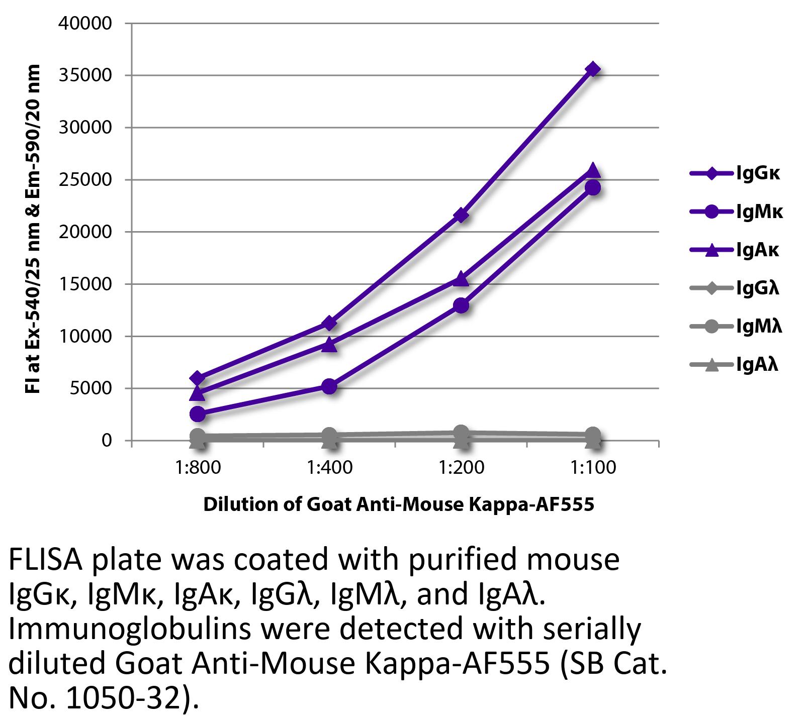 Goat Anti-Mouse Kappa-Alexa Fluor 555 antibody for use in immunohistochemistry / immunocytochemistry and western blot assays.
