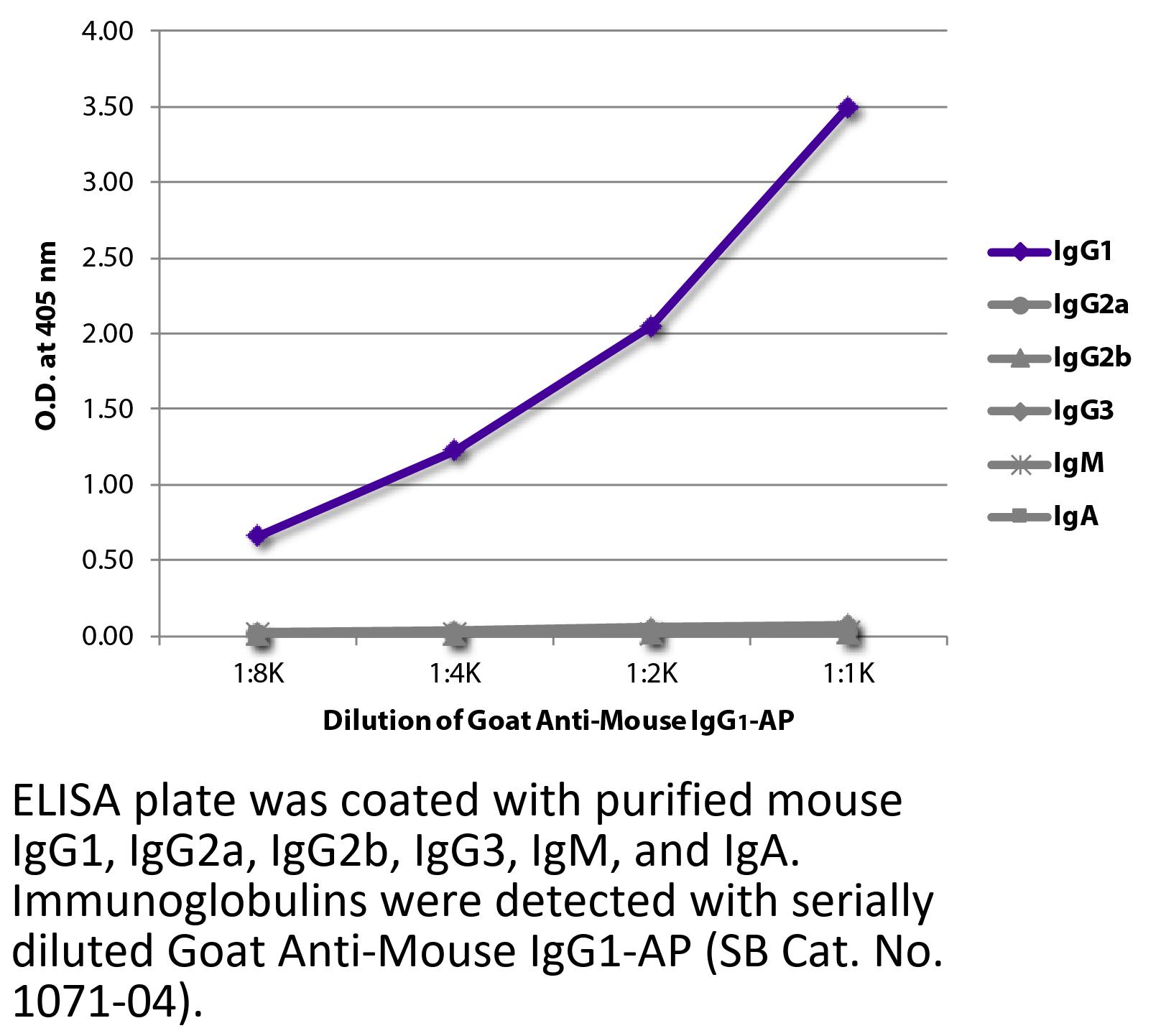 Goat Anti-Mouse IgG1-AP antibody for use in ELISA and immunocytochemistry assays.