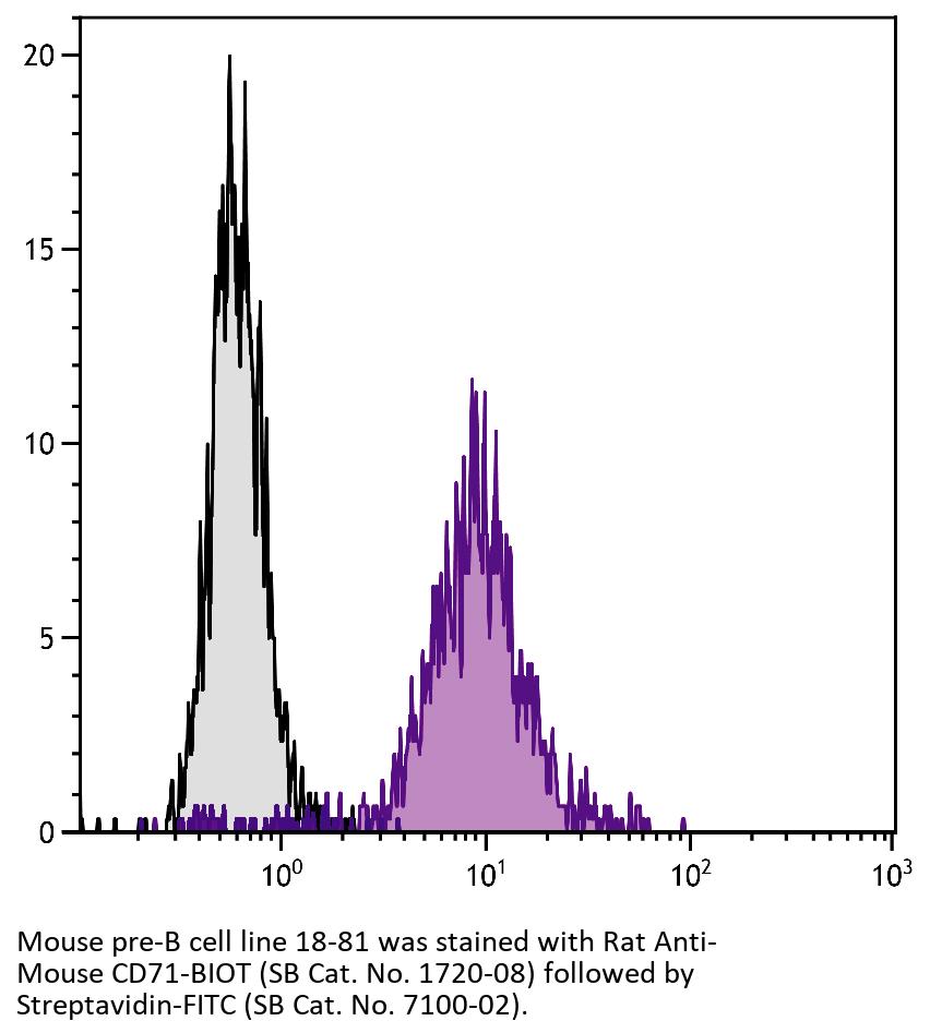 CD71, a type II transmembrane glycoprotein expressed on the cell surface as a homodimer, is the transferrin receptor. It is essential for the growth of normal and neoplastic cells. It is expressed at low levels on resting B and T lymphocytes but is upregulated during responses to antigens and mitogens presumably reflecting the iron dependence of proliferation. Its expression declines with maturation and differentiation. CD71 plays a critical role in cell proliferation by controlling the supply of iron which is essential for many metabolic pathways through the binding and endocytosis of transferrin, the major iron-carrying protein. It may also be involved in signal transduction via its association with the T cell receptor ζ chain. The monoclonal antibody RI7217 inhibits cell proliferation in vitro.