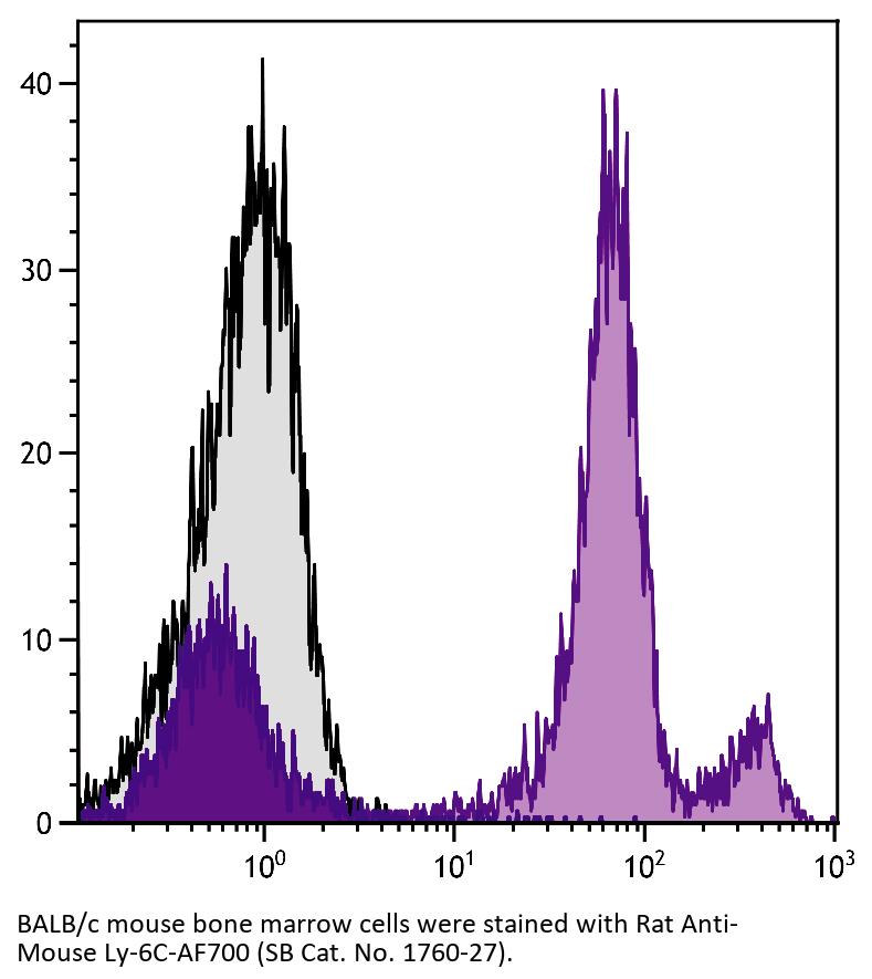Ly-6C is a member of the Ly-6 multigene family of type V glycophosphatidylinositol-anchored cell surface proteins. It is expressed on bone marrow cells, monocytes/macrophages, neutrophils, endothelial cells, and T-cell subsets. Mice with the Ly-6.2 allotype (e.g., AKR, C57BL, C57BR, C57L, DBA/2, PL, SJL, SWR, 129) have subsets of CD4+Ly-6C+ and CD8+Ly-6C+ cells while Ly-6.1 strains (e.g., A, BALB/c, CBA, C3H/He, DBA/1, NZB) have only CD8+Ly-6C+ lymphocytes. Ly-6C may play a role in the development and maturation of lymphocytes.