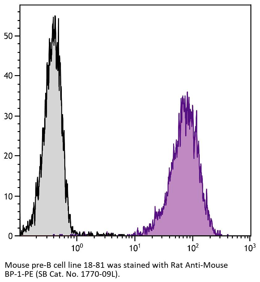 BP-1, also known as Ly-51 and 6C3 antigen, is a type II homodimeric transmembrane glycoprotein formed by two disulfide-linked chains of 140 kDa. Originally identified on the surface of pre-B cell lymphomas the cDNA encoding BP-1 has been cloned and found to represent aminopeptidase A. It is expressed at high levels on bone marrow stromal cell lines which support in vitro B lymphopoiesis and on a wide variety of mouse tissues known to possess aminopeptidase activity. Subsets of normal bone marrow pre-B and B cells express low levels of BP-1 which is rapidly upregulated on pre-B cells in the presence of IL-7. The BP-1 marker is commonly used to identify B cells in different stages of development.