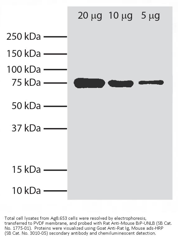 The immunoglobulin heavy chain binding protein BiP is a member of the hsp70 family of heat shock proteins and is identical to the glucose regulated protein GRP78. While BiP was originally described for its function in B cells, it is now known to be distributed in a variety of tissues, if not ubiquitous. The highly conserved hsp70 proteins have an essential physiological role in stress responses and as “molecular chaperones” which are responsible for a variety of functions such as protein transport, prevention of protein toxicity and direction of protein folding. With regard to its immunological role, BiP is a component of the endoplasmic reticulum and binds free intracellular heavy chains in nonsecreting pre-B cell lines (μ+, L-) or incompletely assembled Ig precursors in H+L+ secreting hybridomas and myelomas. In the absence of light chain synthesis, heavy chains remain associated with BiP and are not secreted. BiP is an ATP binding protein and the dissociation of the BiP-heavy chain complex is probably driven by the ATPase activity attributed to BiP. The monoclonal antibody 76-E6 recognizes a conserved epitope localized within the region of amino acids 497 to 581 of BiP.