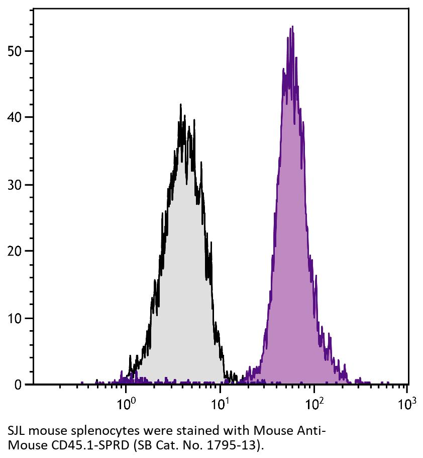 The CD45 antigen is an essential regulator of leukocyte activation and development and is now known to be a protein tyrosine phosphatase, e.g., CD45 is able to dephosphorylate the Src family of protein kinases. This activity is now known to be required for signal transduction induced by T and B cell antigen receptor engagement, cytokine signaling, and Fc receptor stimulation. The functional state of CD45 also has a pronounced effect on lymphocyte development. CD45 exists in multiple forms, such as the restricted variants (CD45R; see companion products 1660, 1665, 1675, 1685, and 1820) and as allelic forms CD45.1 (Ly-5.1) and CD45.2 (Ly-5.2). The former arises as a result of alternative splicing of different exons. The specificity of antibodies to CD45.1 and CD45.2 has been exploited in studies where resolution of donor and recipient cells is essential, such as in gene therapy or bone marrow transplantation. The monoclonal antibody A20 recognizes all mouse leukocytes expressing the CD45.1 allotype.