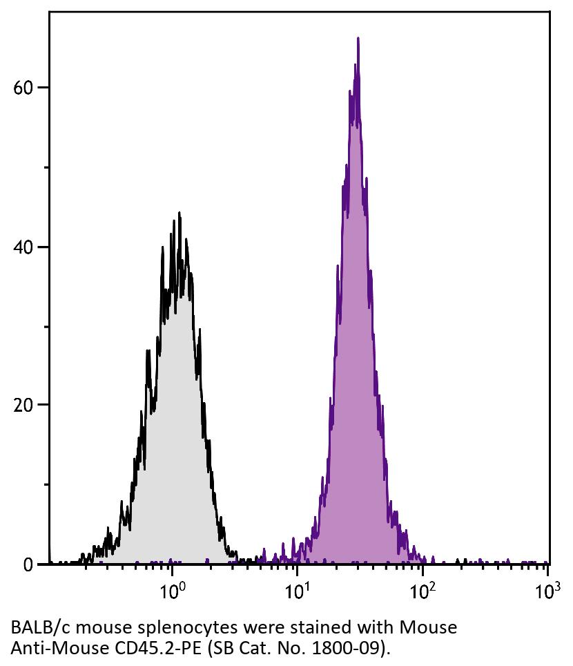 The CD45 antigen is an essential regulator of leukocyte activation and development and is now known to be a protein tyrosine phosphatase, e.g., CD45 is able to dephosporylate the Src family of protein kinases. This activity is known to be required for signal transduction induced by T and B cell antigen receptor engagement, cytokine signaling, and Fc receptor stimulation. The functional state of CD45 also has a pronounced effect on lymphocyte development. CD45 exists in multiple forms, such as the restricted variants (CD45R; see companion products 1660, 1665, 1675, 1685 and 1820) and as allelic forms CD45.1 (Ly-5.1) and CD45.2 (Ly-5.2). The specificity of antibodies to CD45.1 and CD45.2 has been exploited in studies where resolution of donor and recipient cells is essential, such as in gene therapy or bone marrow transplantation. The monoclonal antibody 104 recognizes CD45 (leukocyte common antigen) on all leukocytes of mouse strains expressing the CD45.2 allotype (e.g., A, AKR, BALB/c, CBA/Ca, CBA/J, C3H/He, C57BL, C57BR, C57L, C58, DBA/1, DBA/2, NZB, SWR, 129).