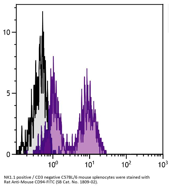 The monoclonal antibody 18d3 reacts with the mouse CD94 receptor subunit, a type II transmembrane glycoprotein. CD94 is expressed on the surface of NK cells, NK T cells, and some memory phenotype CD8+ cells. When CD94 is paired with NKG2A, C, or E subunit, it binds the nonclassical MHC class Ib molecule Qa-1b and results in a CD94high population by flow cytometry. Approximately half of NK cells do not express NKG2A, C or E; these cells express CD94 on the surface in a form that does not bind Qa-1b and is believed to be nonfunctional, producing a CD94low population by flow cytometry. CD94 is thought to play a role in the adhesion and activation of the NK cell lineage.