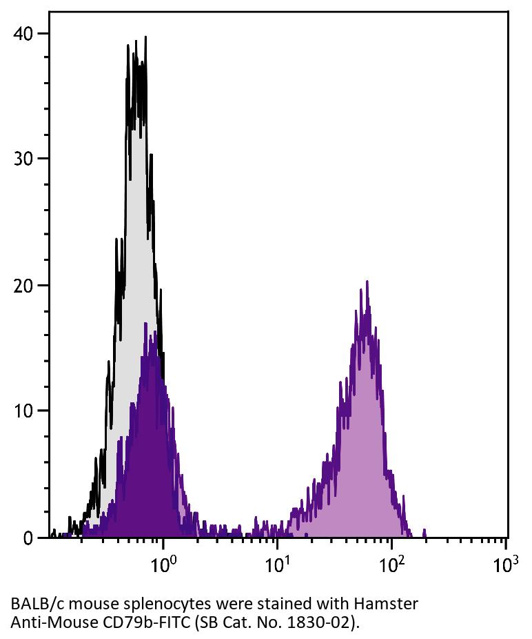 Murine CD79 is a disulfide-linked heterodimer composed of an α chain (CD79a) and a β chain (CD79b) that associates non-covalently with membrane immunoglobulin (Ig) to form the B cell receptor (BCR) complex. Its expression is restricted to B lymphocytes first appearing on the surface at the pro-B cell stage prior to productive Ig gene rearrangements and remaining through all stages of B-cell differentiation prior to plasma cells. It has been proposed that the CD79 complex on pro-B cell surfaces may function to induce early B-cell differentiation.