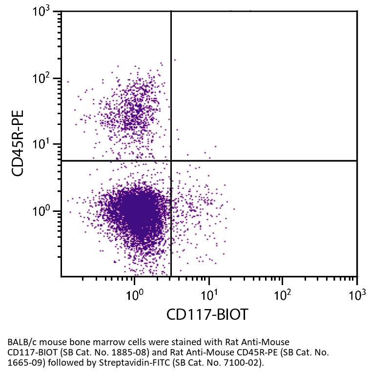 The CD117 (c-Kit) antigen is the cell-surface receptor for stem cell factor (SCF). Together these molecules constitute a ligand/receptor pair which functions to maintain normal hematopoiesis in the adult. Signaling through SCF/c-Kit has an important role in stimulating myeloid and erythroid production of primitive hematopoietic progenitor cells. A variety of cytokines act synergistically with SCF to stimulate proliferation and differentiation of bone marrow progenitor cells. For example, SCF plus IL-7 can stimulate the combined myeloid and B cell differentiation of uncommitted hematopoietic progenitor cells. SCF/c-Kit also participates in erythropoiesis in both the bone marrow and spleen. Loss-of-function mutations for SCF/c-Kit lead to a variety of pleiotropic developmental defects while gain-of-function mutations can lead to constitutive activation of the kit receptor and links to cancer. Examples of the former are mast cell deficiency and severe macrocytic anemia while the latter mutation has been identified in mastocytomas.