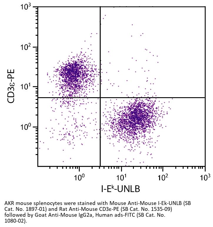 The monoclonal antibody 14-4-4S reacts with the I-Ek class II alloantigen on cells from mice of the H-2d, H-2p, and H-2r haplotypes. Cells from mice of the H-2b, H-2f, H-2q, and H-2s haplotypes do not express I-E antigen. The antibody has been reported to cross-react with the rat MHC class II alloantigen RT1D.