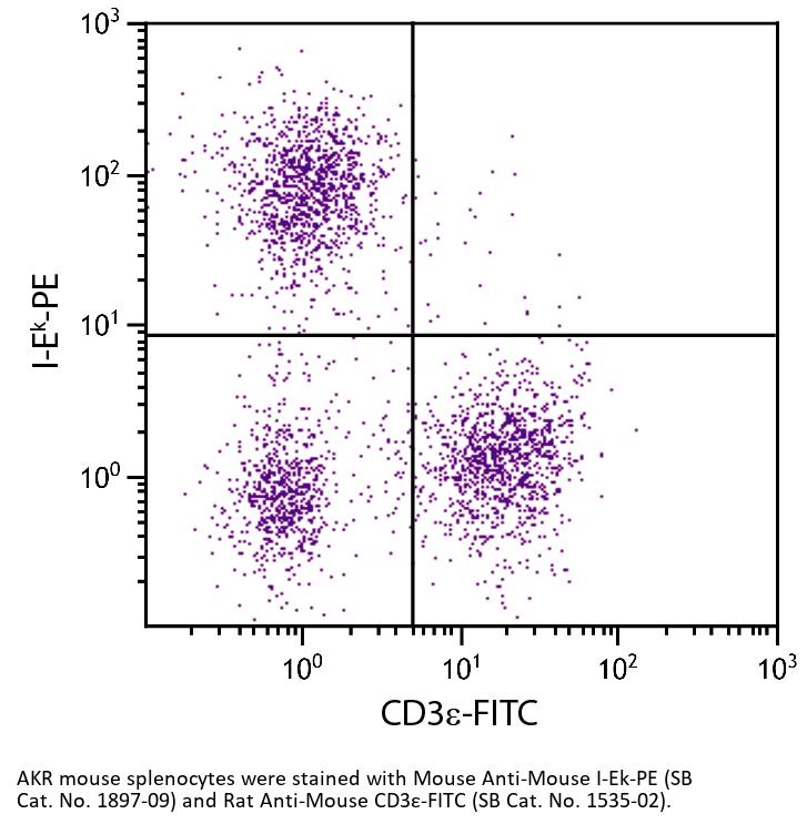 The monoclonal antibody 14-4-4S reacts with the I-Ek class II alloantigen on cells from mice of the H-2d, H-2p, and H-2r haplotypes. Cells from mice of the H-2b, H-2f, H-2q, and H-2s haplotypes do not express I-E antigen. The antibody has been reported to cross-react with the rat MHC class II alloantigen RT1D.
