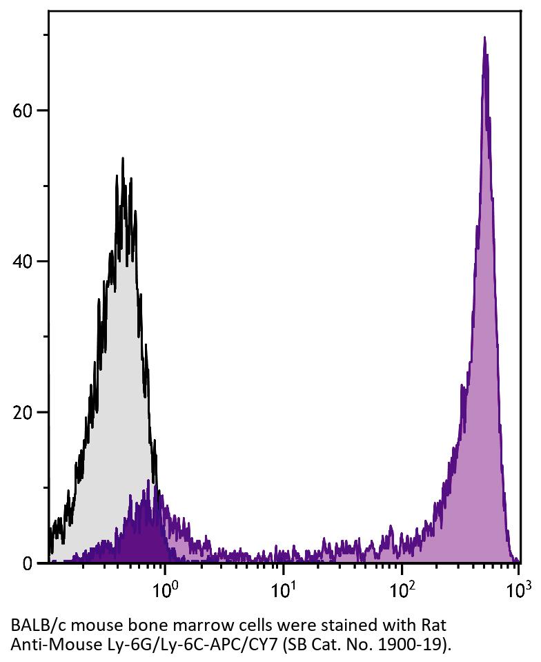 Ly-6G/Ly-6C, formerly known as the myeloid differentiation antigen Gr-1, is a GPI-anchored protein. In the bone marrow, the level of antigen expression is directly correlated with granulocyte differentiation and maturation. It is also transiently expressed on monocytes in the bone marrow. In the periphery, Ly-6G/Ly-6C is expressed predominantly on neutrophils.