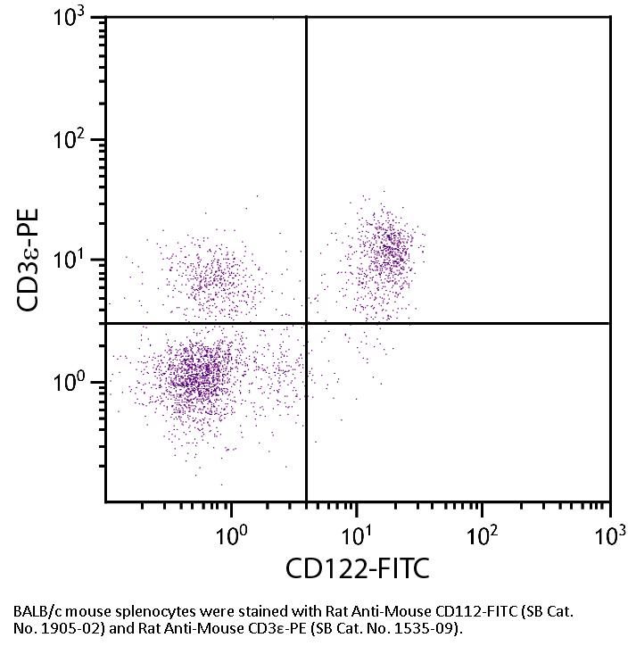 The IL-2 receptor is a complex of three distinct polypeptide chains: (i) the α chain which binds IL-2 with low affinity; (ii) the β chain that binds IL-2 with high affinity; and (iii) the common γ chain (γc) that does not bind IL-2. The high affinity receptor complex is an α/β/γ heterotrimer with a Kd of 1.3 x 10-11 M. In mouse spleen, CD122 is expresed on ~30% of CD8+ cells and all NK cells but <1% of B cells and CD4+ T lymphocytes. In the thymus, its expression is confined to CD4-CD8+ single positive and CD4-CD8- double negative cells. Cytoplasmic regions of the IL-2R β chain are involved in IL-2-mediated cellular signaling and, via the interaction of IL-2 and its receptor complex, may be involved in the generation and differentiation of T lymphocytes. The monoclonal antibody 5H4 does not block IL-2 binding.