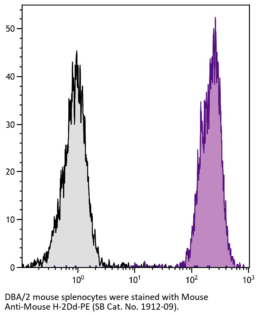 The monoclonal antibody 34-5-8S reacts with a conformational epitope on H-2Dd MHC Class I found on the N-terminal domains of α1 and α2 chains when complexed with β2-microglobulin. The antibody does not react with H-2Dd α chains synthesized in vitro. Weak cross-reactivity with cells from mice of the H-2b, H-2q, and H-2s haplotypes has been observed by flow cytometric analysis. Reactivity with cells from mice of the H-2f, H-2k, H-2p, and H-2r haplotypes has not been observed. 34-5-8S has been reported to block the recognition of H-2Dd by Ly-49A+, Ly-49C+, and Ly-49G2+ natural killer cells.