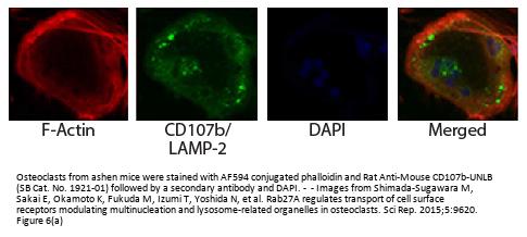CD107b, also known as lysosomal-associated membrane protein 2 (LAMP-2), is a heavily glycosylated type I transmembrane protein that constitutes one of the two major sialoglycoproteins on lysosomal membranes that can be used to distinguish lysosomes from other organelles. CD107b is similar in structure to Mac-1 and is expressed primarily on epithelial cells and macrophages in a variety of organs in normal and beige mutant mice.