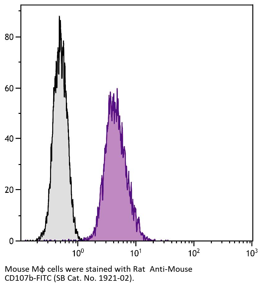 CD107b, also known as lysosomal-associated membrane protein 2 (LAMP-2), is a heavily glycosylated type I transmembrane protein that constitutes one of the two major sialoglycoproteins on lysosomal membranes that can be used to distinguish lysosomes from other organelles. CD107b is similar in structure to Mac-1 and is expressed primarily on epithelial cells and macrophages in a variety of organs in normal and beige mutant mice.