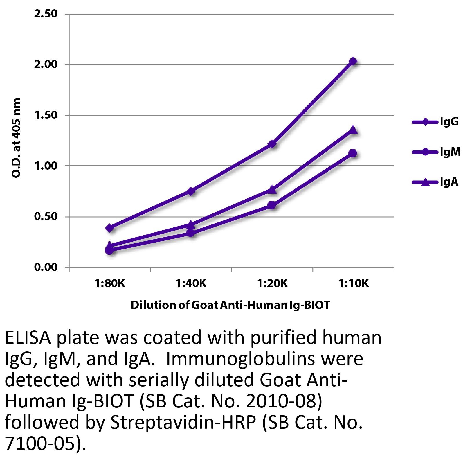 Goat Anti-Human Ig-Biotin antibody for use in ELISA, flow cytometry, immunocytochemistry, western blot, and multiplex assays.
