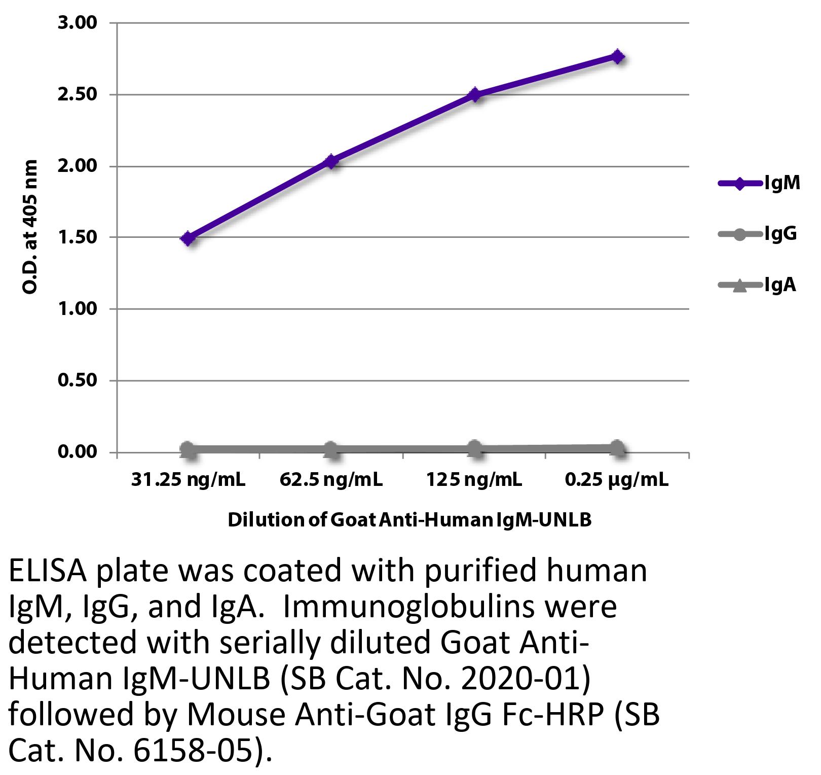 Purified Goat Anti-Human IgM antibody for use in ELISA, flow cytometry, immunohistochemistry / immunocytochemistry, western blot, immunoprecipitation, ELISpot, multiplex, stimulation, purification, and depletion assays.