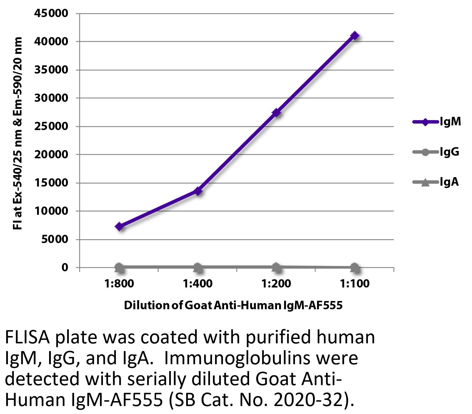 Goat Anti-Human IgM-Alexa Fluor 555 antibody for use in immunohistochemistry / immunocytochemistry and western blot assays.