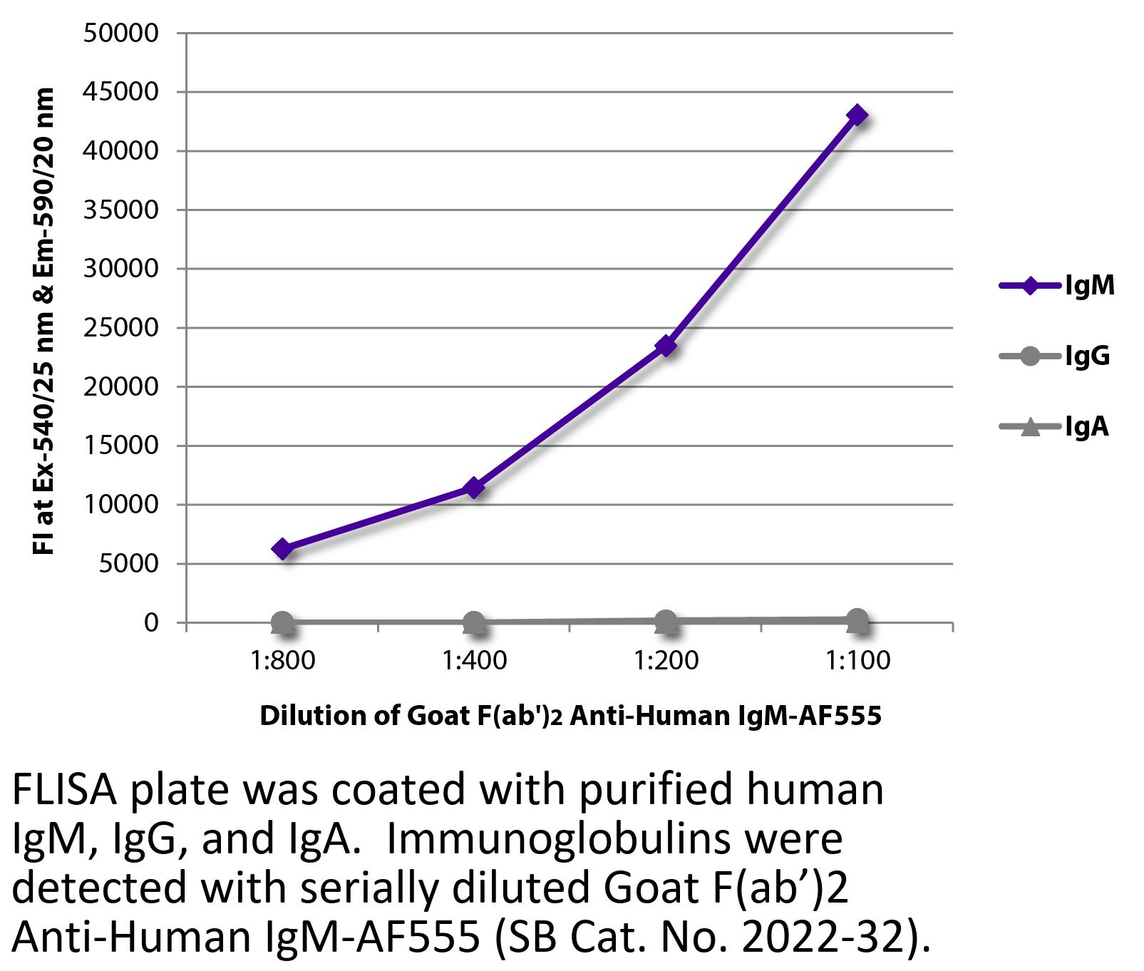 Goat F(ab')2 Anti-Human IgM-Alexa Fluor 555 antibody for use in immunocytochemistry assays.