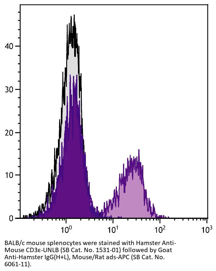 Goat Anti-Hamster IgG(H+L)-APC antibody with minimal reactivity to mouse and rat proteins for use in flow cytometry assays.