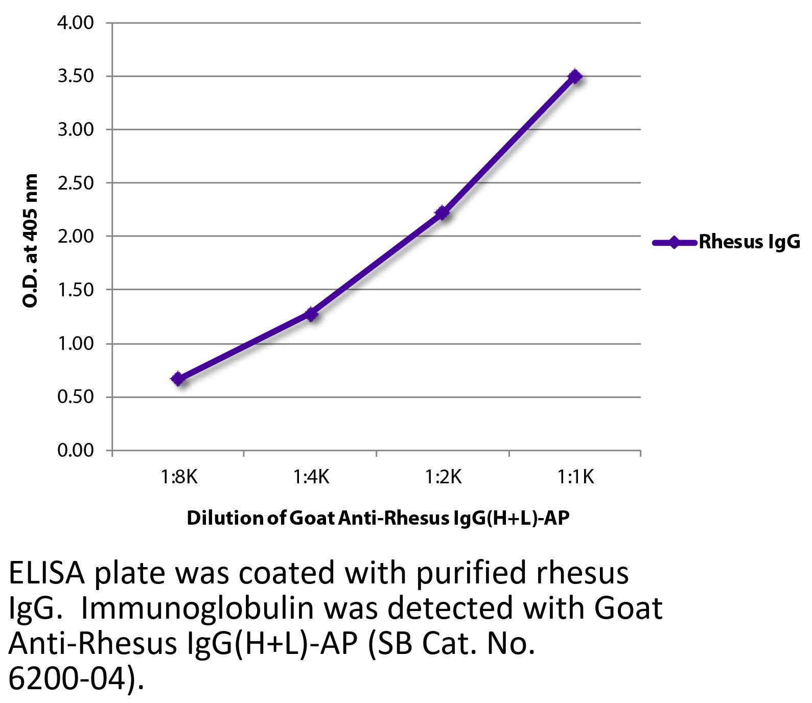 Goat Anti-Rhesus IgG(H+L)-AP antibody for use in ELISA, immunocytochemistry, and western blot assays.