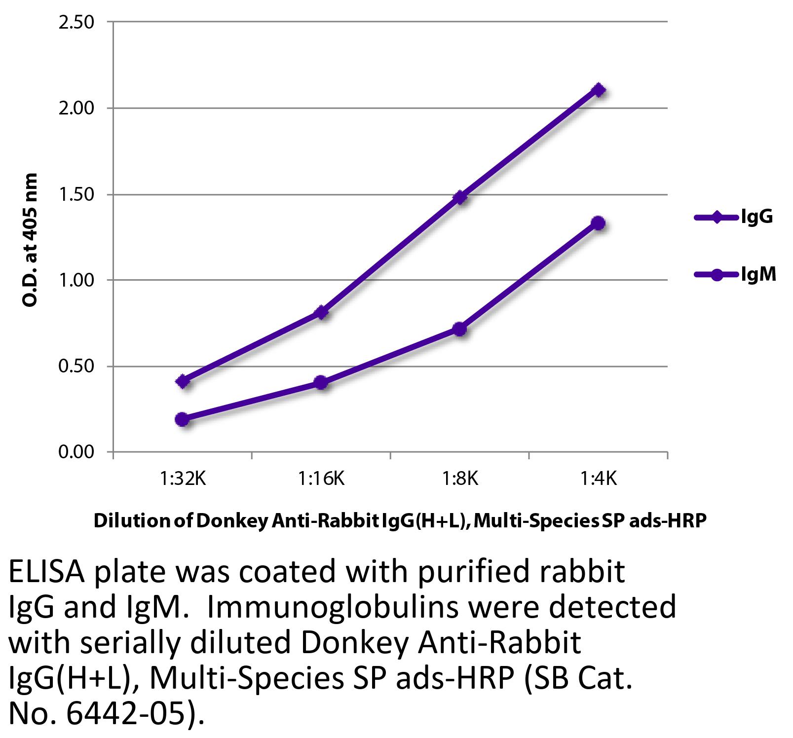 Donkey Anti-Rabbit IgG(H+L)-HRP antibody with minimal reactivity to human, mouse, rat, bovine, horse, hamster, goat, sheep, chicken, and guinea pig serum proteins for use in ELISA and immunohistochemistry / immunocytochemistry assays.
