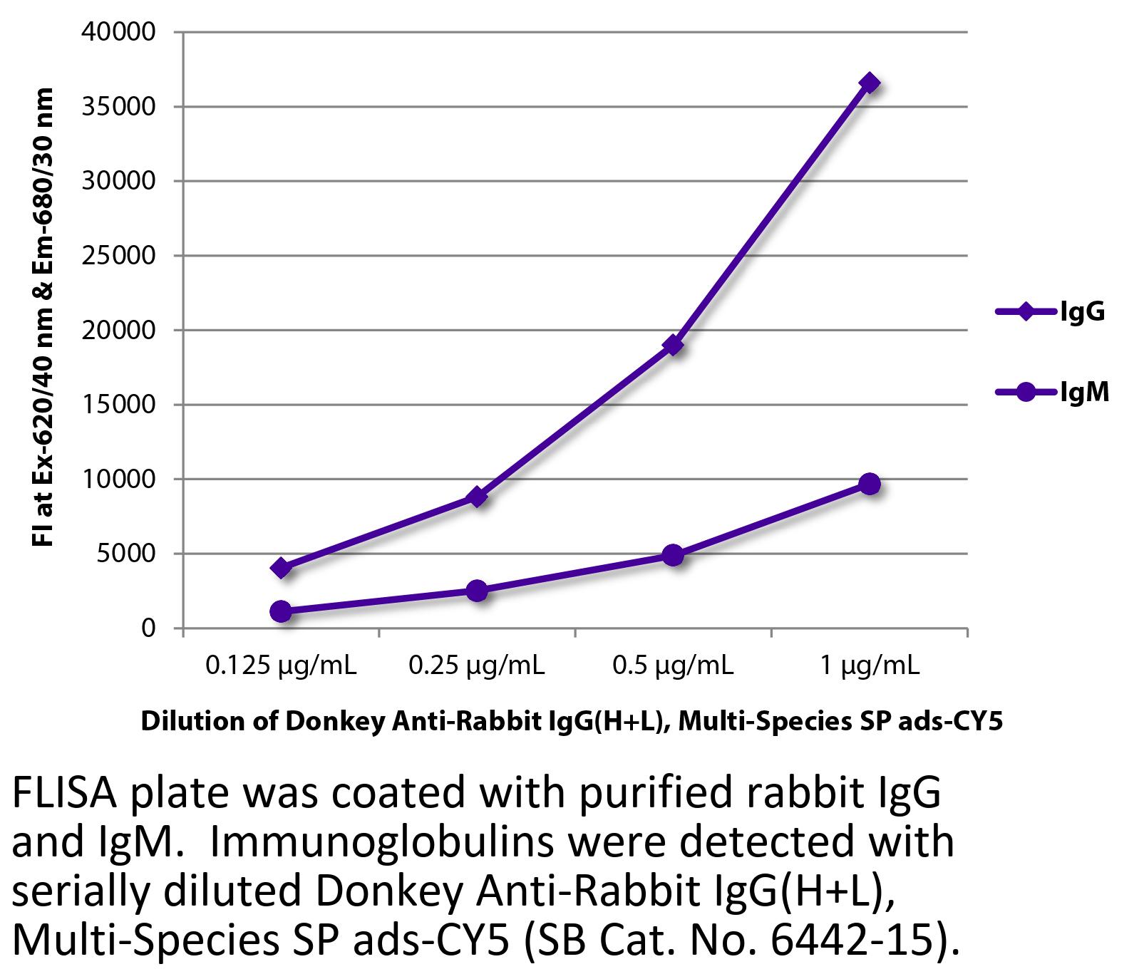 Donkey Anti-Rabbit IgG(H+L)-CY5 antibody with minimal reactivity to human, mouse, rat, bovine, horse, hamster, goat, sheep, chicken, and guinea pig serum proteins for use in immunohistochemistry / immunocytochemistry assays.