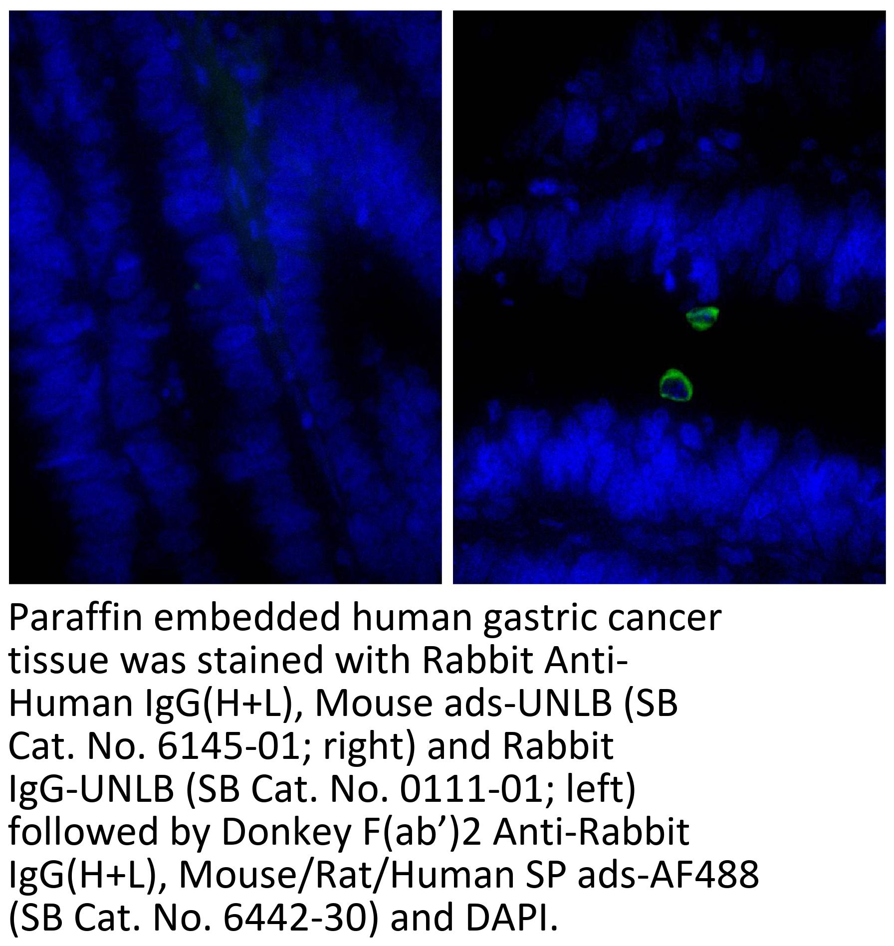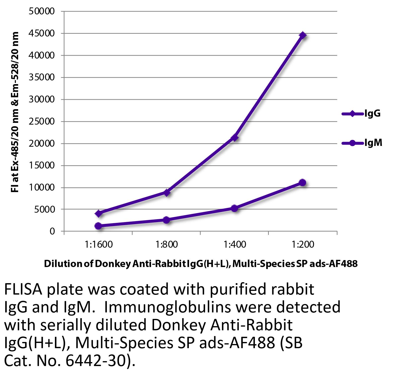 Donkey Anti-Rabbit IgG(H+L)-Alexa Fluor 488 antibody with minimal reactivity to human, mouse, rat, bovine, horse, hamster, goat, sheep, chicken, and guinea pig serum proteins for use in immunohistochemistry / immunocytochemistry assays.
