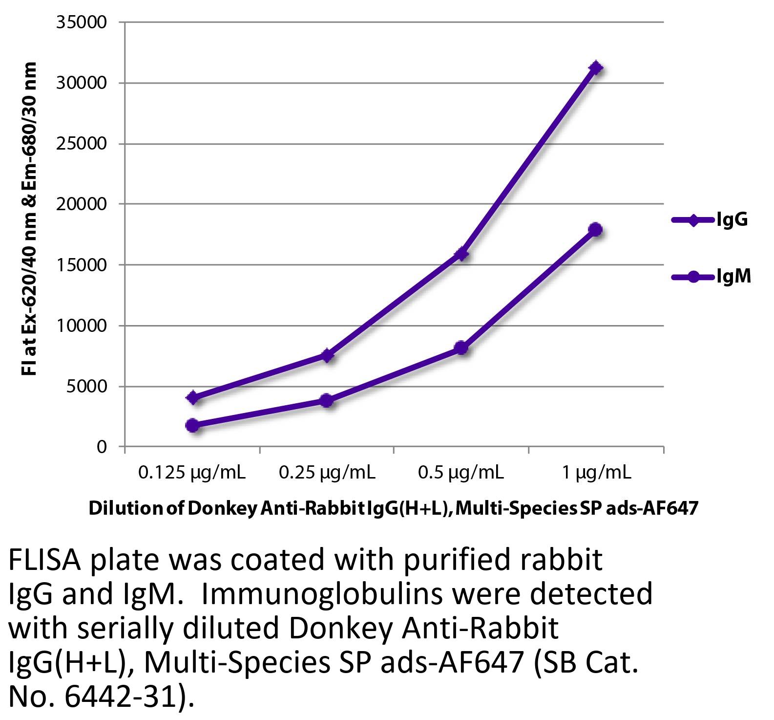 Donkey Anti-Rabbit IgG(H+L)-Alexa Fluor 647 antibody with minimal reactivity to human, mouse, rat, bovine, horse, hamster, goat, sheep, chicken, and guinea pig serum proteins for use in immunohistochemistry / immunocytochemistry assays.