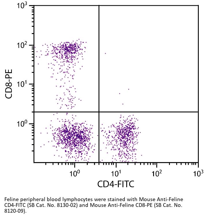 Feline CD4, a member of the immunoglobulin superfamily of cell surface receptors, is a type I transmembrane glycoprotein that is expressed on the helper/inducer subpopulation of peripheral T lymphocytes. It is present on approximately 55% of thymocytes, 15% of splenocytes, 40% of lymph node cells, and 25% of peripheral blood lymphocytes. CD4 functions as an accessory molecule in the recognition of foreign antigens in association with MHC Class II antigens by T cells.