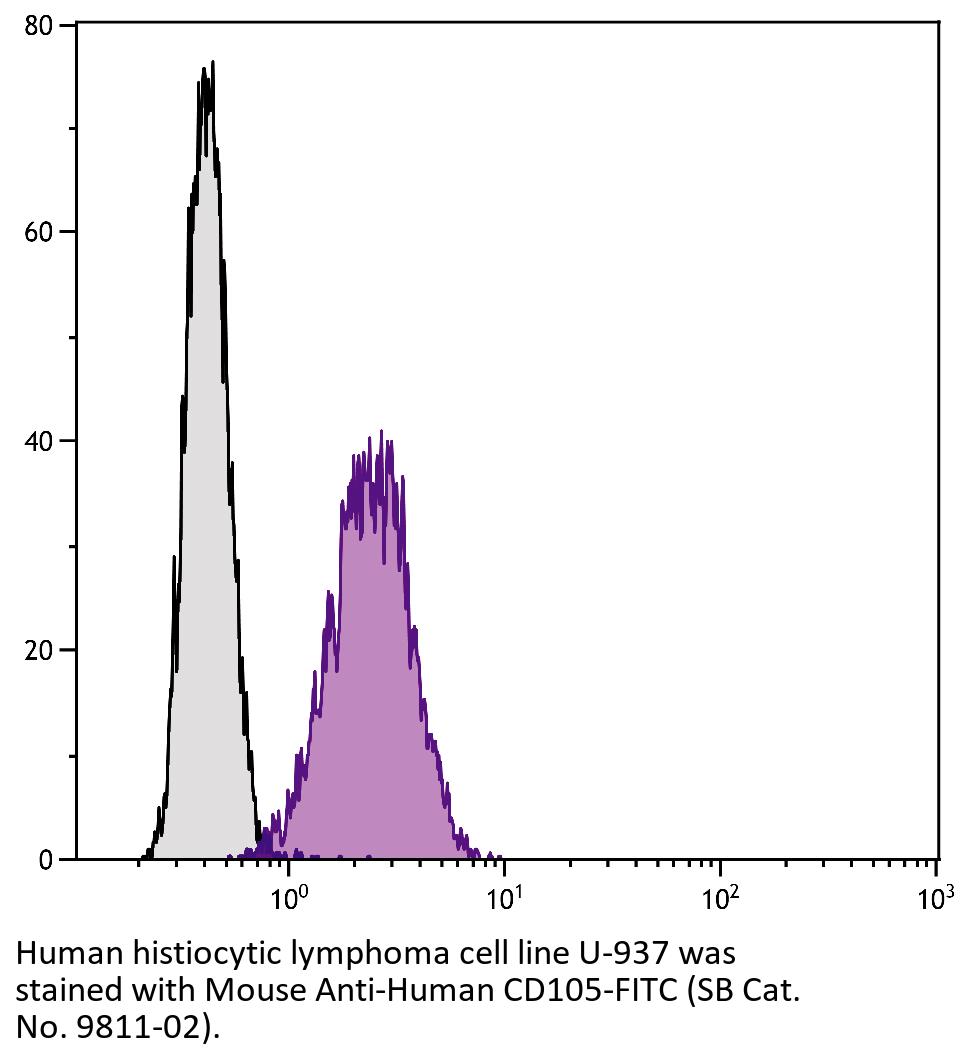 CD105, also known as endoglin, is a 90 kDa type II transmembrane glycoprotein that is expressed on the cell surface as a disulfide-linked homodimer and is found on endothelial cells. CD105 is one of several receptors for the various isoforms of TGFβ which in turn is one of a family of proteins involved in regulation of cell differentiation, migration of cells, and control on the immune response.