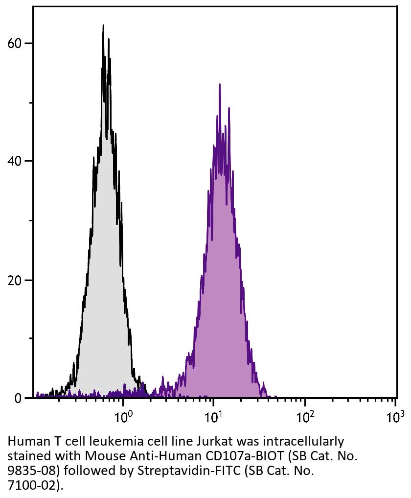 CD107a, also known as lysosomal-associated membrane protein 1 (LAMP-1), is a heavily glycosylated type I transmembrane protein that constitutes the major sialoglycoproteins on lysosomal membranes. It is a ligand for galaptin, an S-type lectin present in extracellular matrix, through its recognition of acetyllactosamine oligosaccharide chains, and is a ligand for E-selectin-mediated cell adhesion. CD107a is expressed by activated T cells, macrophages, dendritic cells, activated platelets, tonsillar epithelium, and some tumor cell lines, including U937 and KG1a. It is also a widely expressed intracellular antigen. LAMP-1 may function in protecting the inner surface of the lysosomal membrane by forming a barrier to lysosomal hydrolases. The upregulation of both CD107a and CD107b on the surface of tumor cell lines has been associated with their enhanced metastatic potential where they may increase adhesion to extracellular matrix and endothelium.