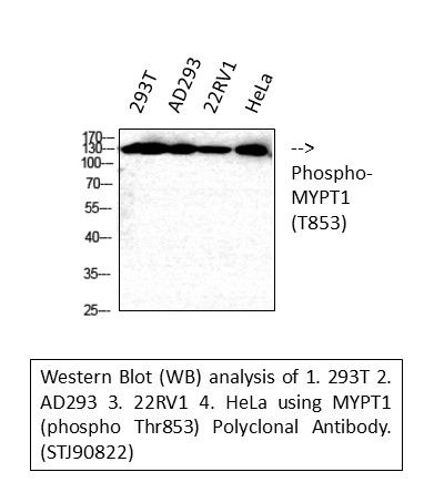 Phospho-MYPT1 (T853) Polyclonal Antibody detects endogenous levels of MYPT1 protein only when phosphorylated at T853.