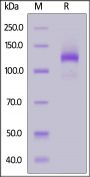 This protein carries a human IgG1 Fc tag at the C-terminus. The protein has a calculated MW of 107.4 kDa. The protein migrates as 120-140 kDa under reducing (R) condition (SDS-PAGE) due to glycosylation.