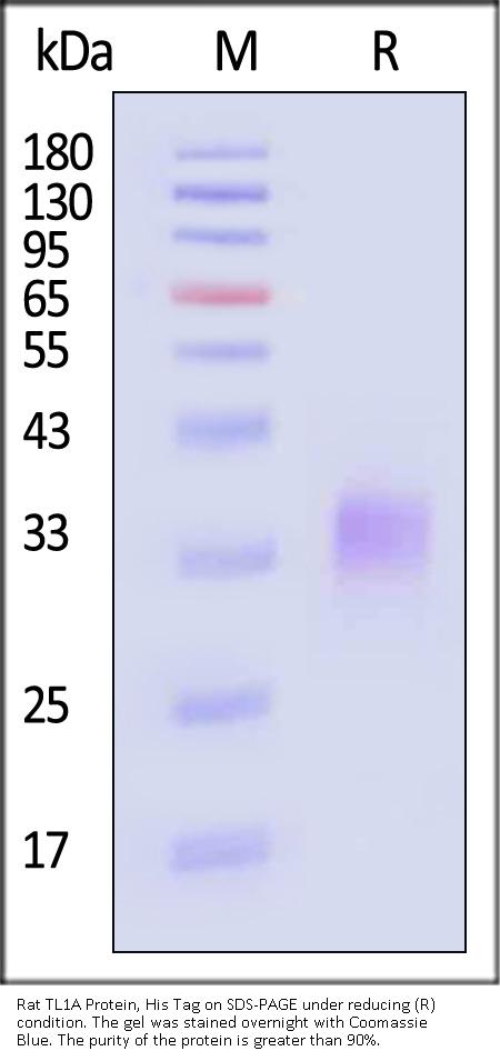 This protein carries a polyhistidine tag at the N-terminus. The protein has a calculated MW of 23.6 kDa. The protein migrates as 33-38 kDa when calibrated against Star Ribbon Pre-stained Protein Marker under reducing (R) condition (SDS-PAGE) due to glycosylation.