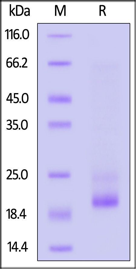 This protein carries a polyhistidine tag at the C-terminus. The protein has a calculated MW of 18.3 kDa. The protein migrates as 19-21 kDa when calibrated against Star Ribbon Pre-stained Protein Marker under reducing (R) condition (SDS-PAGE) due to glycosylation.