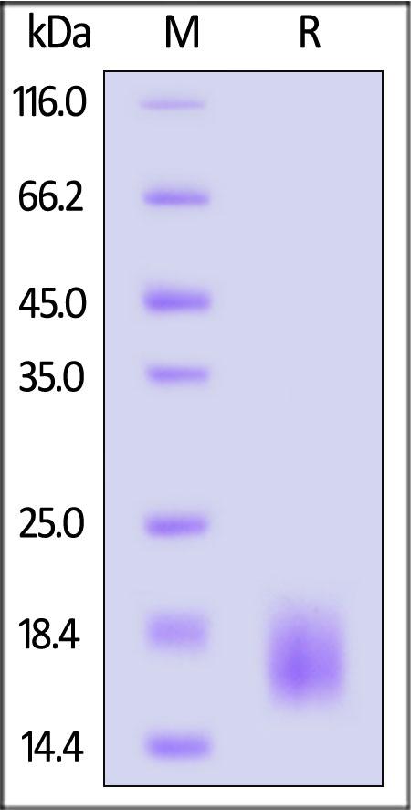 This protein carries a polyhistidine tag at the N-terminus. The protein has a calculated MW of 12.8 kDa. The protein migrates as 15-19 kDa under reducing (R) condition (SDS-PAGE) due to glycosylation.