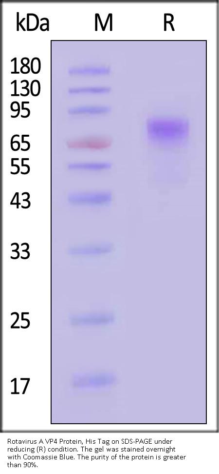 Rotavirus A (strain RVA/Human/United States/Wa/1974/G1P1A[8]) VP4 Protein, His Tag (VP4-R5243) is expressed from human 293 cells (HEK293). It contains AA Gly 26 - Asn 476 (Accession # P11193).