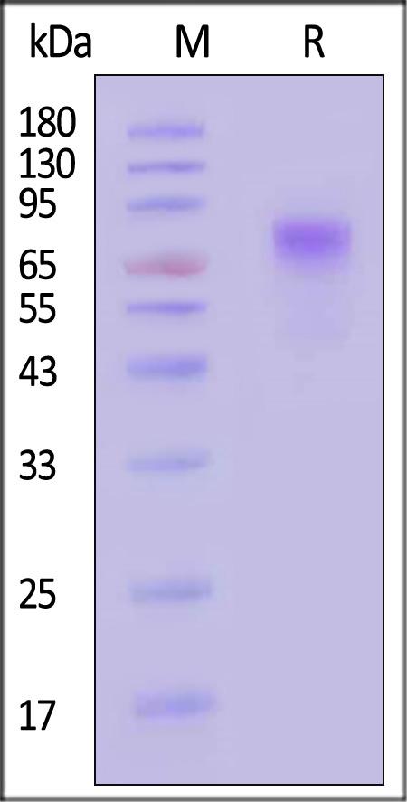 This protein carries a polyhistidine tag at the N-terminus. The protein has a calculated MW of 52.9 kDa. The protein migrates as 65-85 kDa when calibrated against Star Ribbon Pre-stained Protein Marker under reducing (R) condition (SDS-PAGE) due to glycosylation.