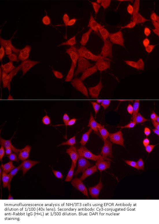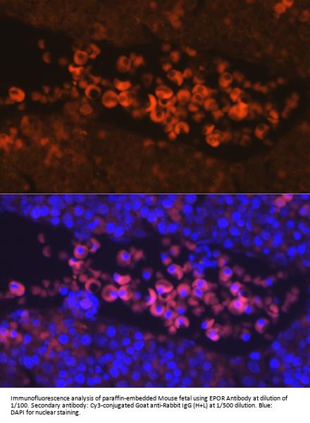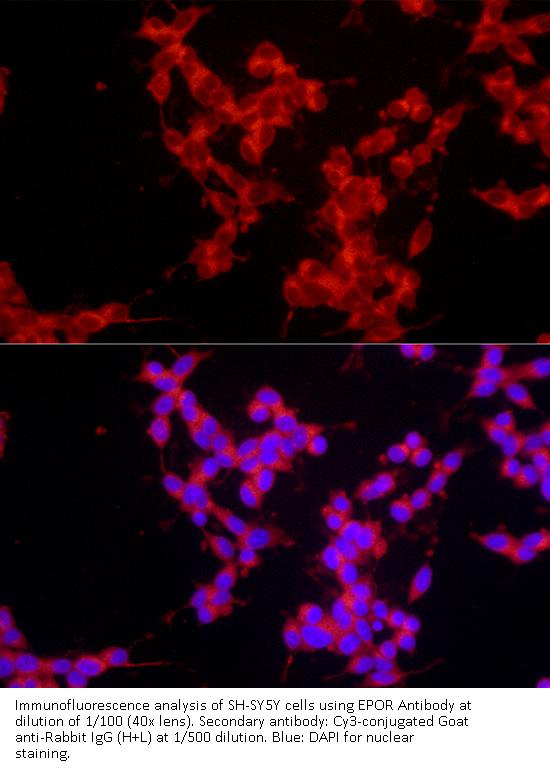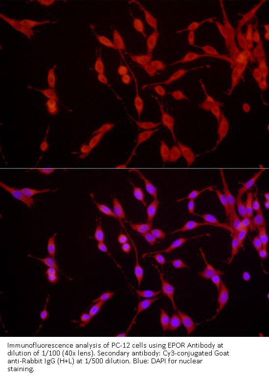 EPOR Antibody is a Rabbit Polyclonal antibody against EPOR. This gene encodes the erythropoietin receptor which is a member of the cytokine receptor family. Upon erythropoietin binding, this receptor activates Jak2 tyrosine kinase which activates different intracellular pathways including: Ras/MAP kinase, phosphatidylinositol 3-kinase and STAT transcription factors. The stimulated erythropoietin receptor appears to have a role in erythroid cell survival. Defects in the erythropoietin receptor may produce erythroleukemia and familial erythrocytosis. Dysregulation of this gene may affect the growth of certain tumors. Alternate splicing results in multiple transcript variants.